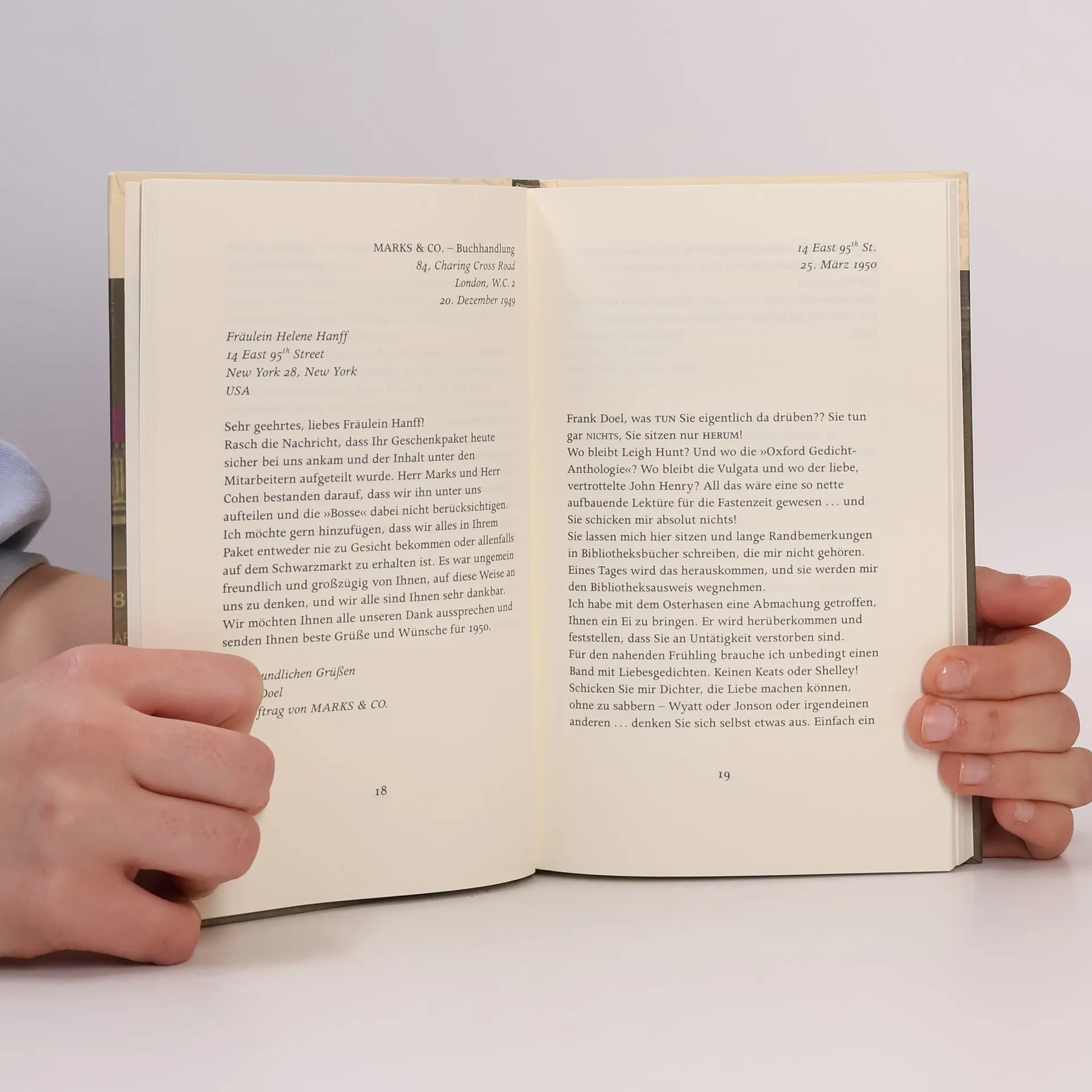 Eine Hymne auf die Literatur und auf die Freundschaft ist der Briefwechsel zwischen der klugen, kämpferischen New Yorkerin Helene Hanff und den liebenswerten Angestellten eines kleinen Antiquariats in Londons Charing Cross Road. Durch Zufall stößt die amerikanische Bühnenschriftstellerin Helene Hanff Ende der 40er Jahre auf die Adresse eines kleinen Antiquariats in London. Eine neue Quelle für schwer aufzutreibende Bücher? Die Autorin greift zur Feder, ohne zu ahnen, dass diese ersten Zeilen den Beginn einer jahrzehntelangen Brieffreundschaft markieren. Zunächst ist die Korrespondenz zwischen ihr und dem Londoner Buchhändler Frank Doel noch allein von der gemeinsamen Leidenschaft für Bücher geprägt. Frank treibt für Helene rare Buchausgaben auf, man spricht über Autoren, Werke und Buchausstattungen. Doch mit der Zeit werden die Briefe persönlicher und weiten sich auf das gesamte Personal von Marks & Co. aus. Helene erzählt von ihrem Alltag in New York, ihrer Arbeit und aktuellen Ereignissen. Aus London wiederum erfährt die Amerikanerin, wie knapp die Lebensmittel zu jener Zeit sind, und schickt Care-Pakete an ihre Lieben. Im Gegenzug erhält sie wertvolle Erstausgaben und das eine oder andere unentbehrliche Rezept. Schließlich erreichen die Briefe eine Vertrautheit, wie man sie sonst nur zwischen wirklich guten Freunden findet.