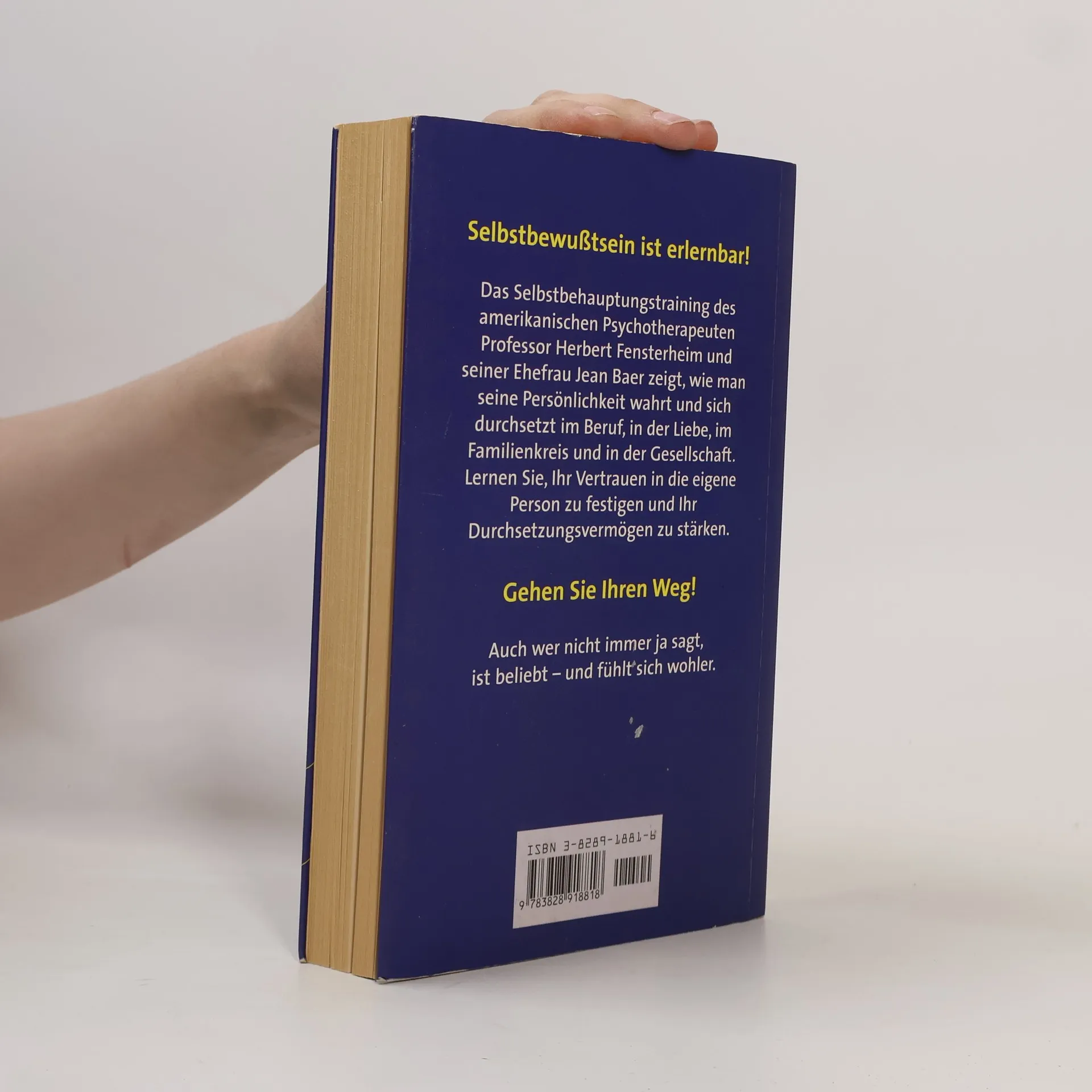 Seit Jahrzenten erfolgreich: das Standardwerk zum Thema Selbstbewusstsein Selbstsicherheit kann man lernen – mit dem Training des amerikanischen Psychotherapeuten Professor Herbert Fensterheim und der Journalistin Jean Baer. Das Programm, mit dem sie schon Millionen Menschen geholfen haben, demonstriert, wie man das Vertrauen in die eigene Person stärkt und sich durchsetzt – im Beruf, in der Liebe, im Familienkreis, in der Gesellschaft.