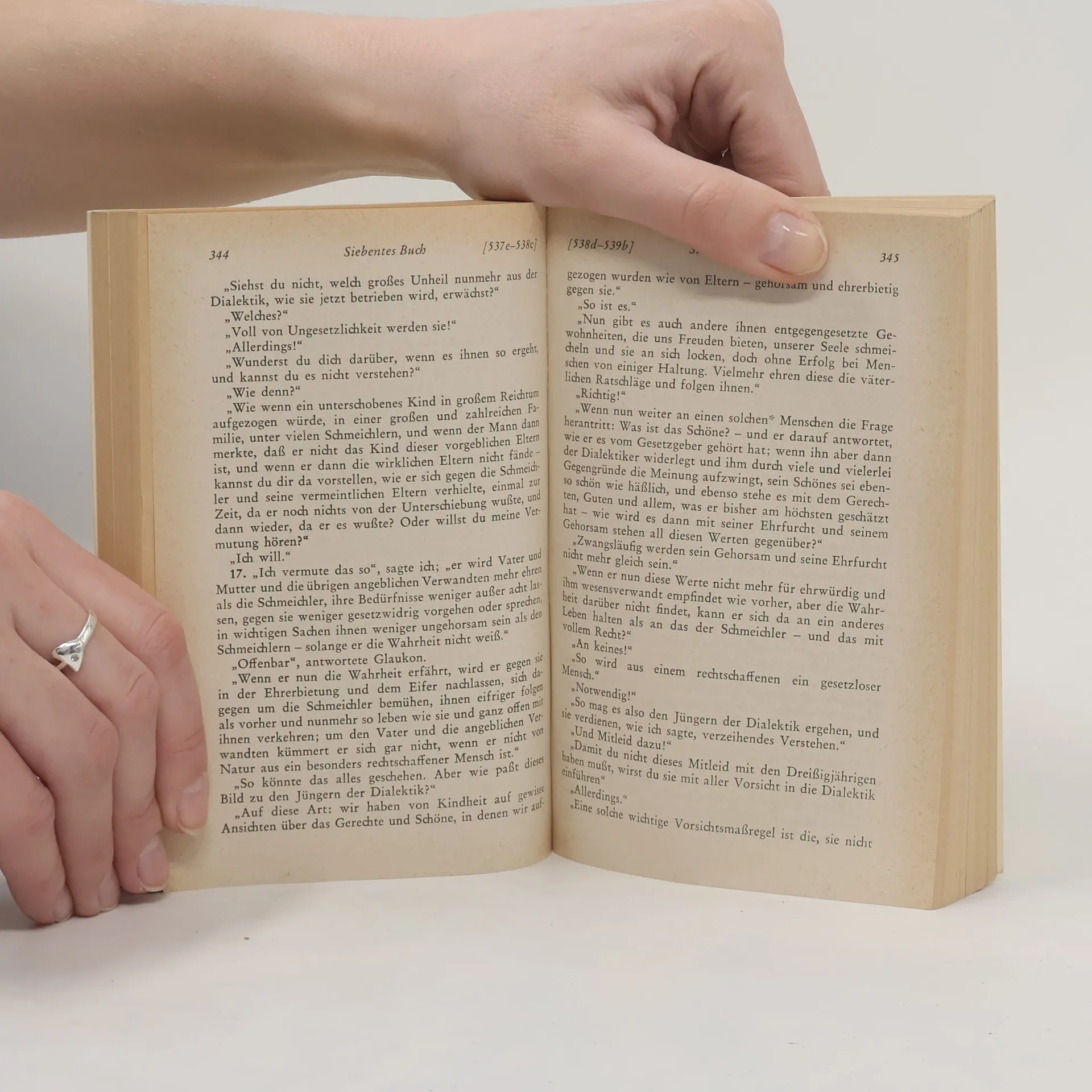 Um die Frage zu beantworten, was Gerechtigkeit in der Seele des Menschen ist, entwirft Platon das Muster einer guten Polis, in der drei Stände (Bauern, Handwerker, Kaufleute etc. - Wächter - Philosophen) jeweils durch ihr spezifisches Tun zum Gelingen des Gemeinwesens beitragen. Platons Modell ist geradezu kulturrevolutionär mit seinen Paradoxien, den Anweisungen, die gegen den zeitgenössischen gesunden Menschenverstand der Athener verstossen. Frauen und Männer sollen gleich sein; der Wächter- und Philosophenstand soll über kein Privateigentum verfügen und auch Frauen und Kinder sollen ihnen gemeinsam sein; schliesslich sollen die Philosophen regieren. Den Grund dafür veranschaulicht Platon im Höhlengleichnis. Die Philosophen, aufgestiegen aus der Höhle der Unwissenheit zur Erkenntnis der Idee des Guten, haben die Pflicht, wieder zu den Mitmenschen hinabzusteigen und deren Seelen aus der gewöhnlichen Verirrung zum Wahren umzulenken.(Amazon)