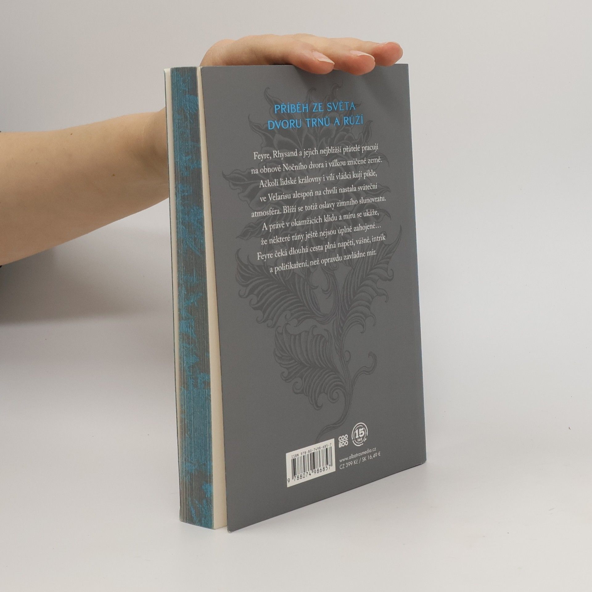 Pokračování bestsellerové young adult série Dvůr trnů a růží s novou obálkou a ořízkou. Feyre, Rhysand a jejich nejbližší přátelé pracují na obnově Nočního dvora i válkou zničené země. Ačkoli lidské královny i vílí vládci kují pikle, ve Velarisu alespoň na chvíli nastala sváteční atmosféra. Blíží se totiž oslavy zimního slunovratu. A právě v okamžicích klidu a míru se ukáže, že některé rány ještě nejsou úplně zahojené… Feyre čeká dlouhá cesta plná napětí, vášně, intrik a politikaření, než opravdu zavládne mír.