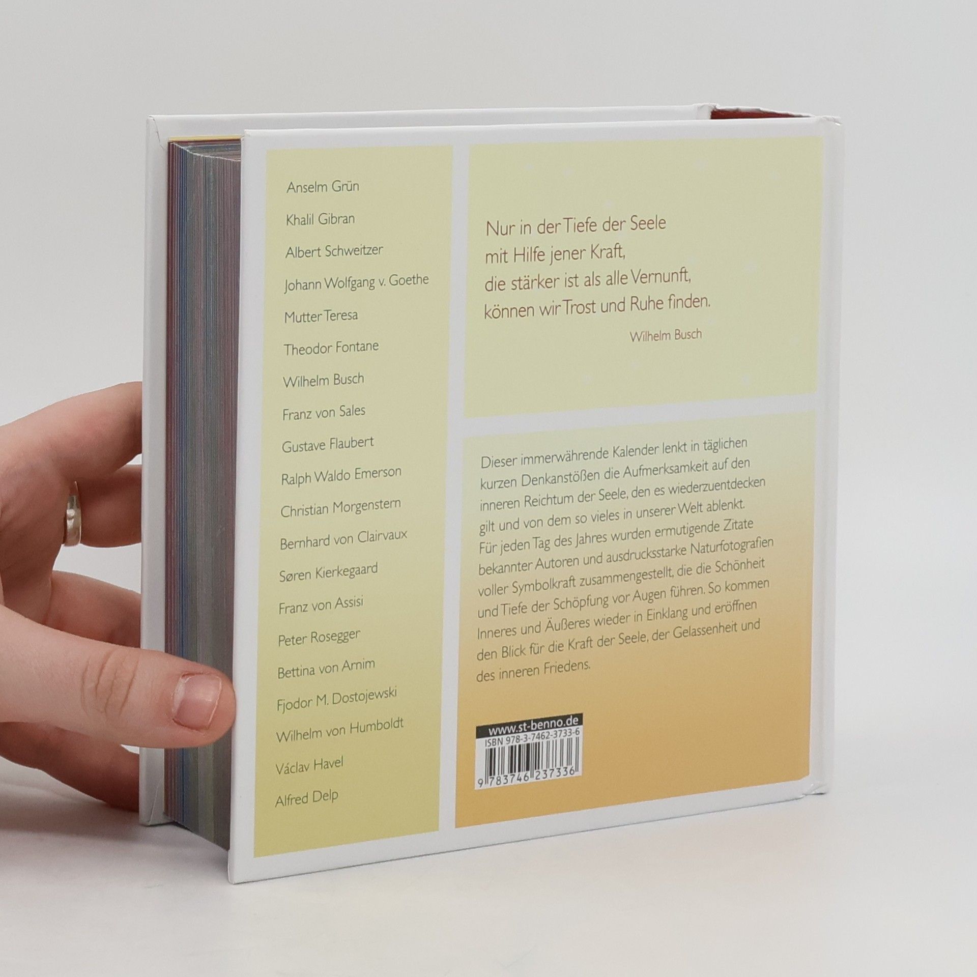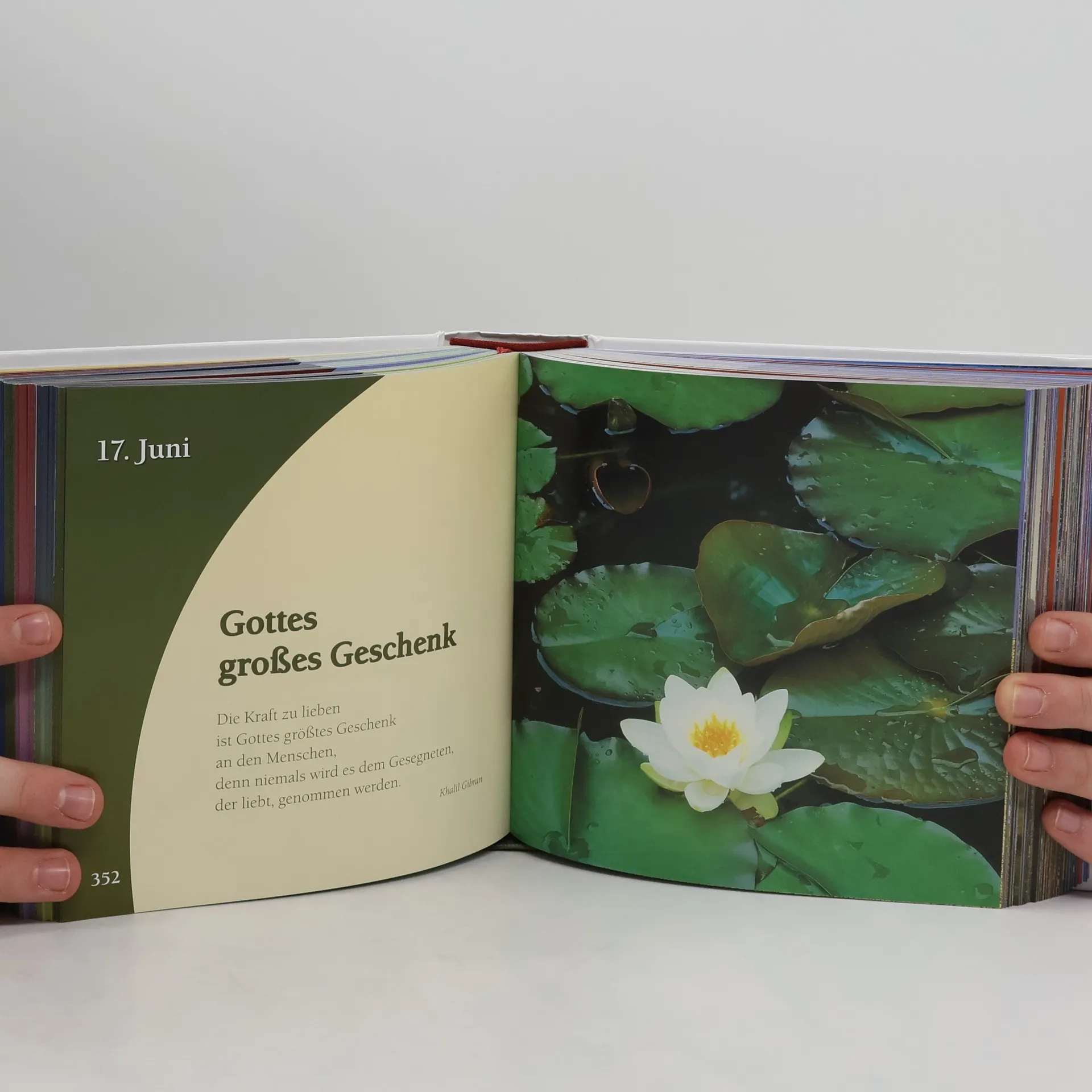 Mehrfach war dieses Buch in den christlichen Bestsellerlisten, nun ist es wieder als Sonderausgabe erhältlich. Jeder Monat dieses immerwährenden Jahreslesebuches ist einem Thema wie Glaube, Liebe, Hoffnung, Zuversicht oder Gelassenheit gewidmet. Prägnante Zitate und Texte beliebter Autoren wie Khalil Gibran, Mutter Teresa, John Henry Newman, Wilhelm Raabe oder aus der Bibel werden von wunderschönen Naturfotografien untermalt.