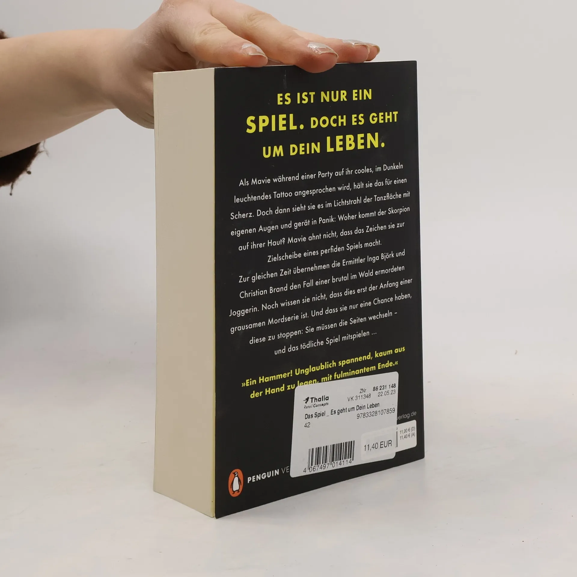 Es ist nur ein Spiel. Doch es geht um dein Leben.Als Mavie während einer Party auf ihr cooles, im Dunkeln leuchtendes Tattoo angesprochen wird, hält sie das für einen Scherz. Doch dann sieht sie es im Lichtstrahl der Tanzfläche mit eigenen Augen und gerät in Woher kommt der Skorpion auf ihrer Haut? Mavie ahnt nicht, dass das Zeichen sie zur Zielscheibe eines perfiden Spiels macht.Zur gleichen Zeit übernehmen die Ermittler Inga Björk und Christian Brand den Fall einer brutal im Wald ermordeten Joggerin. Noch wissen sie nicht, dass dies erst der Anfang einer grausamen Mordserie ist. Und dass sie nur eine Chance haben, diese zu Sie müssen die Seiten wechseln – und das tödliche Spiel mitspielen … »In diesem Fall geht’s gleich richtig zur Sache – da lässt Herr Fitzek grüßen. Ein Buch, das fesselt!« – Sonntag Express