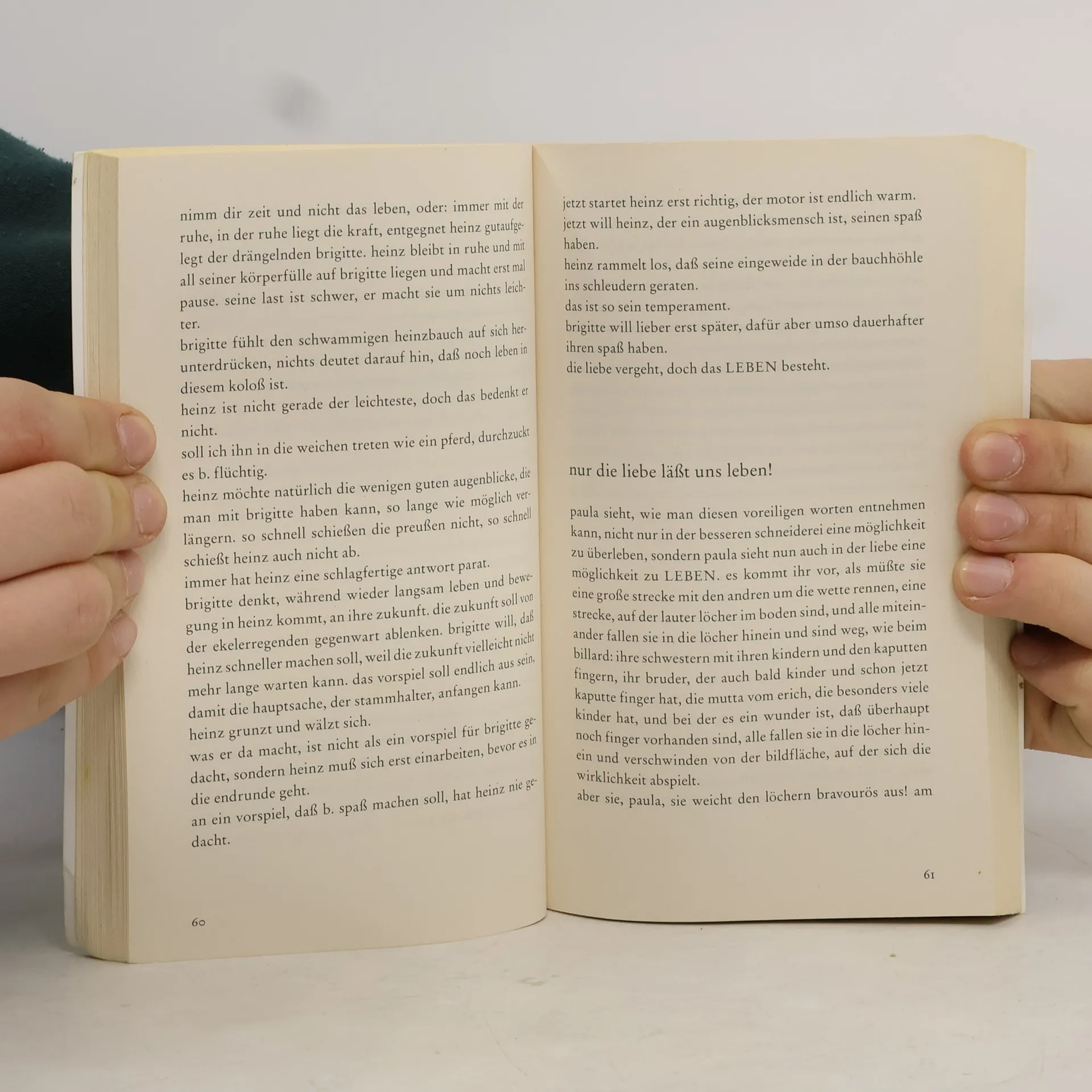Auch in diesem Roman der österreichischen Autorin fasziniert das buchstäblich unheimliche Talent, Alltagsgeschichten auf den Grund zu gehen. Welche Entfaltungsmöglichkeiten hat eine Arbeiterin? Sie kann einen Mann heiraten, der ihr den gesellschaftlichen Aufstieg garantiert. Doch wie andere Möglichkeiten, so sind auch sozial attraktive Männer rar, und die attraktivsten sind schon vergeben. So setzt zwischen zwei «Liebhaberinnen» ein Konkurrenzkampf auf Leben und Besserleben ein, der mit Wucht ausgetragen wird.«Beide ‹Liebhaberinnen› sind die Betrogenen. ‹wenn einer ein Schicksal hat, dann ist es ein mann. wenn einer ein schicksal bekommt, dann ist es eine frau.› ... Bestechend an dieser Schriftstellerin ist die Genauigkeit und Schärfe, mit der sie in eine Welt falscher Glücksvorstellungen eindringt.» (Frankfurter Rundschau)