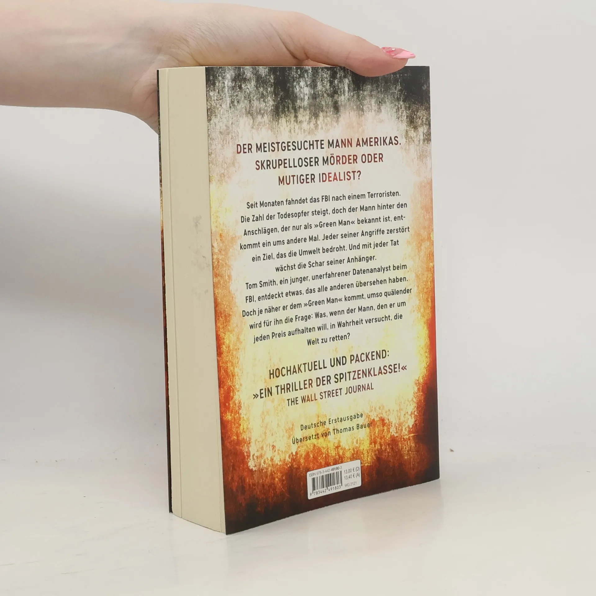 Seit Monaten fahndet das FBI erfolglos nach einem Terroristen. Die Zahl der Todesopfer steigt, doch der Mörder, der nur als »Green Man« bekannt ist, entkommt ein ums andere Mal. Jeder Angriff ist strategisch geplant, um ein Ziel zu zerstören, das die Umwelt bedroht. Und mit jedem Anschlag wächst die Schar seiner Anhänger. Tom Smith, ein junger, unerfahrener Datenanalyst beim FBI, glaubt etwas entdeckt zu haben, das alle anderen übersehen haben. Doch als er sich Amerikas gefährlichstem Mann nähert, muss er sich die Frage stellen: Was, wenn der Mann, den er um jeden Preis aufhalten will, in Wahrheit versucht, die Welt zu retten?