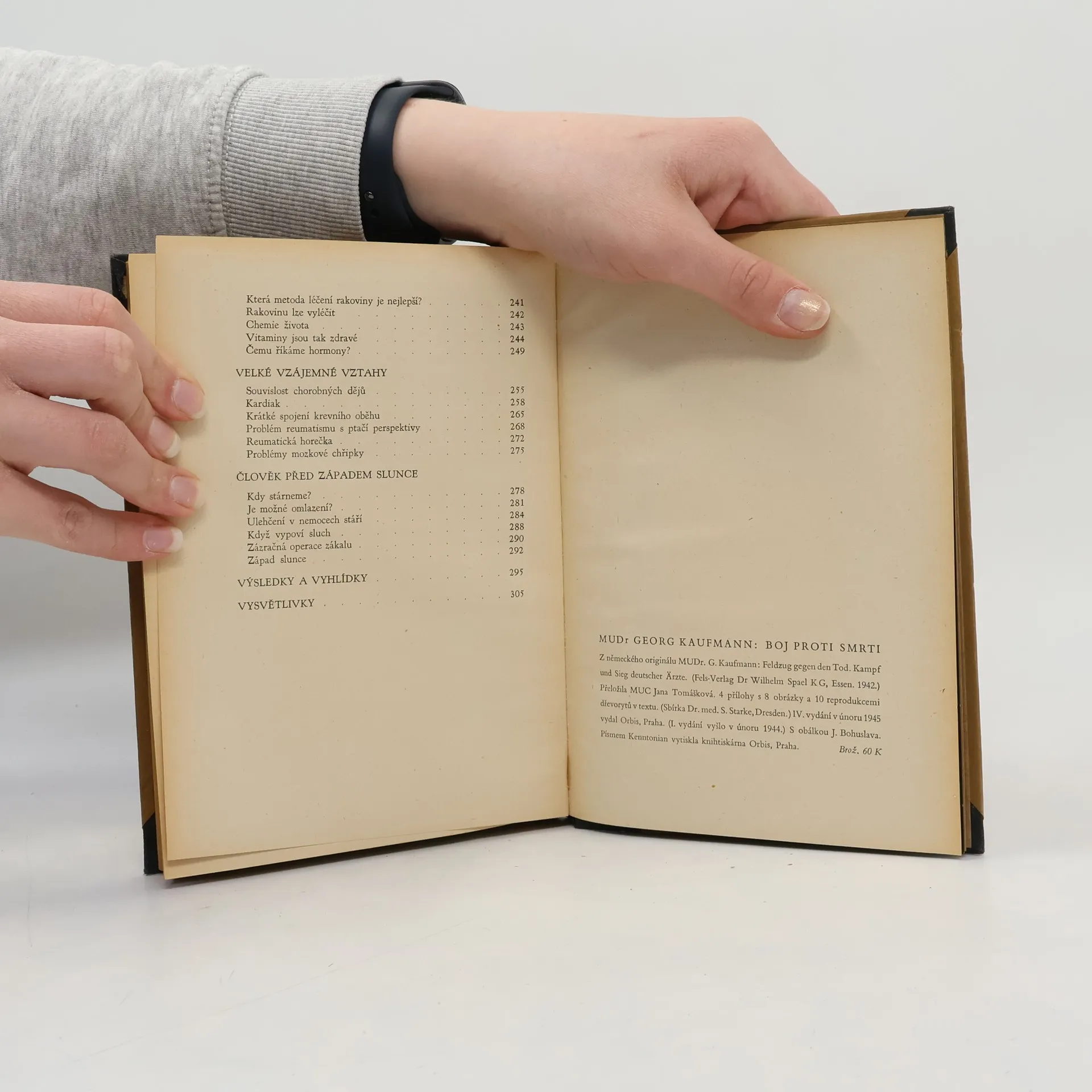 Kniha o lékařství, např. zde jsou popsány začátky léčby schizofrenie pomocí insulinových šoků. Autor MUDr.Georg Kaufmann líčí, jak po náhodném předávkování insulinu u diabetika, trpícího zároveň schizofrenií, došlo ke zlepšení… Z německého originálu MUD.. G. Kaufmann: Feldzuggegen den Tod. Kampf und Sieg deutscher Ärzte. (Fels-Verlag Dr Wilhelm Spael KG, Essen. 1942.) Obsahuje 4 přílohy s 8 obrázky a 10 reprodukçemi dřevorytů v textu. (Sbírka Dr. med. S. Starke, Dresden.) IV. vydání v únoru 1945 vydal Orbis, Praha. (I. vydání vyšlo v únoru 1944.) S obálkou J. Bohuslava. Pismem Kenntonian vytiskla knihtiskárna Orbis, Praha.