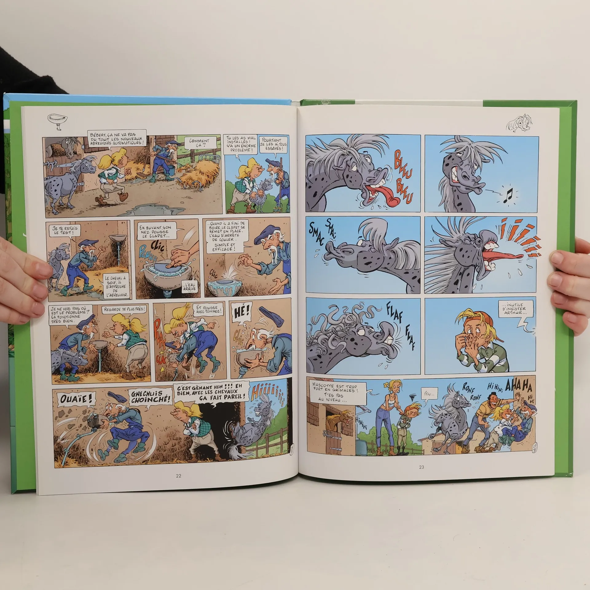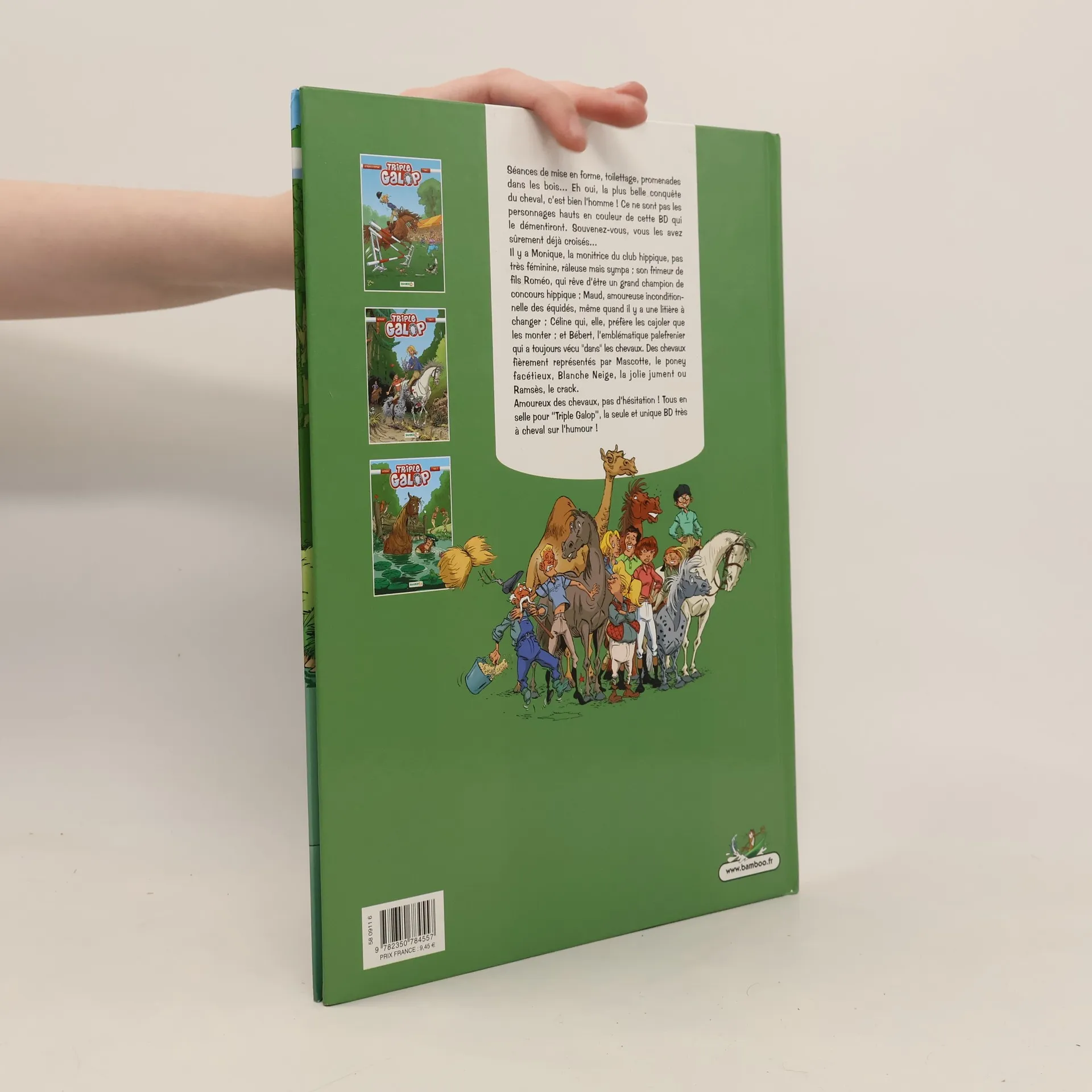 Révolution chez Triple Galop ! Quand aucun témoin humain n'est présent, les chevaux s'expriment enfin par le verbe. Et ils en ont de belles à raconter, nos canassons. Surtout Mascotte le poney, toujours prêt pour une bonne blague. Quant à Obélix le percheron, il peut confier ses états d'âmes à la jument Blanche-Neige. Celle-ci est très à cheval sur la confidentialité. Il faut dire qu'entre une directrice un peu bornée, un palefrenier bourru, un cavalier crâneur, une monitrice affriolante et quelques mômes espiègles, au club hippique, il y a toujours matière à se moquer !