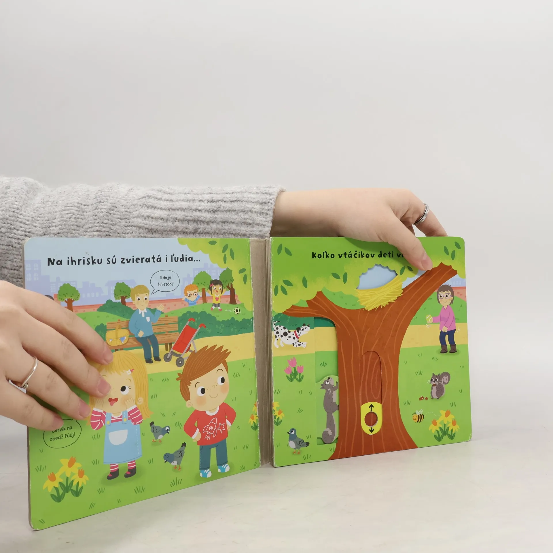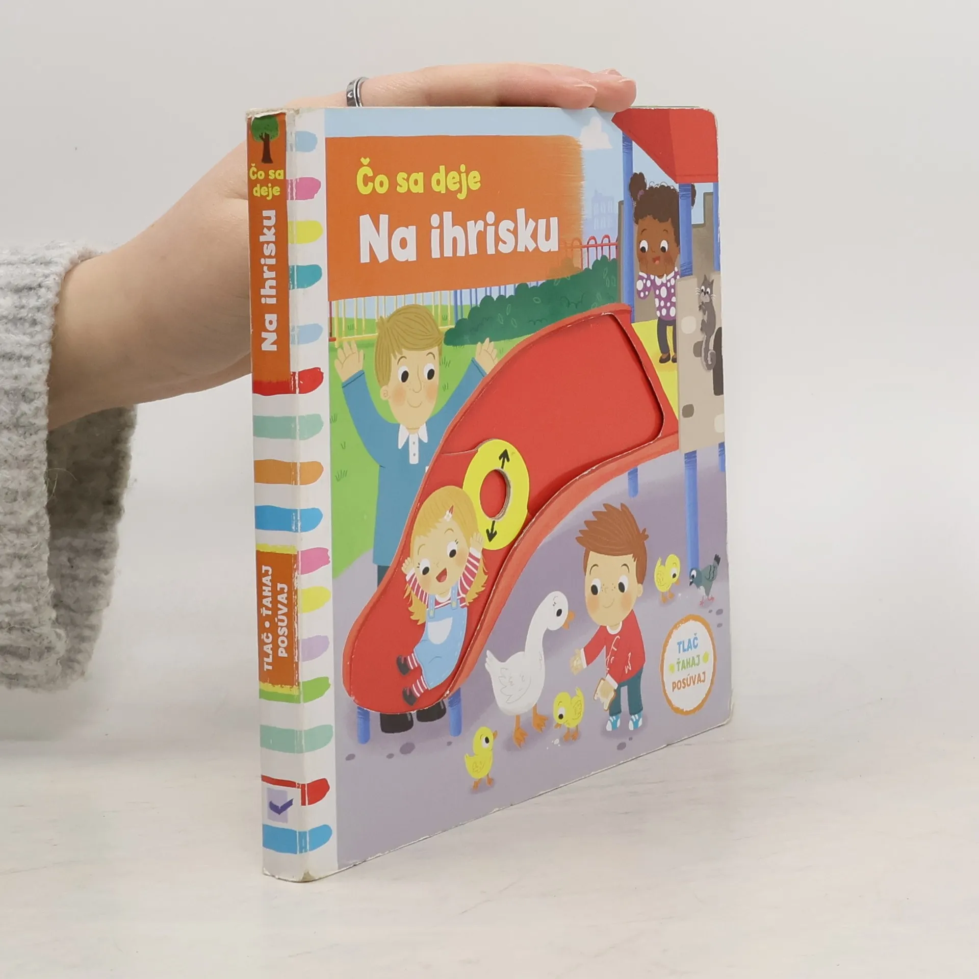 Leporelo je určené deťom od jedného roka. Má pevné stránky s posuvnými a otočnými prvkami. Zisti, čo sa deje na ihrisku a precvič si jemnú motoriku.