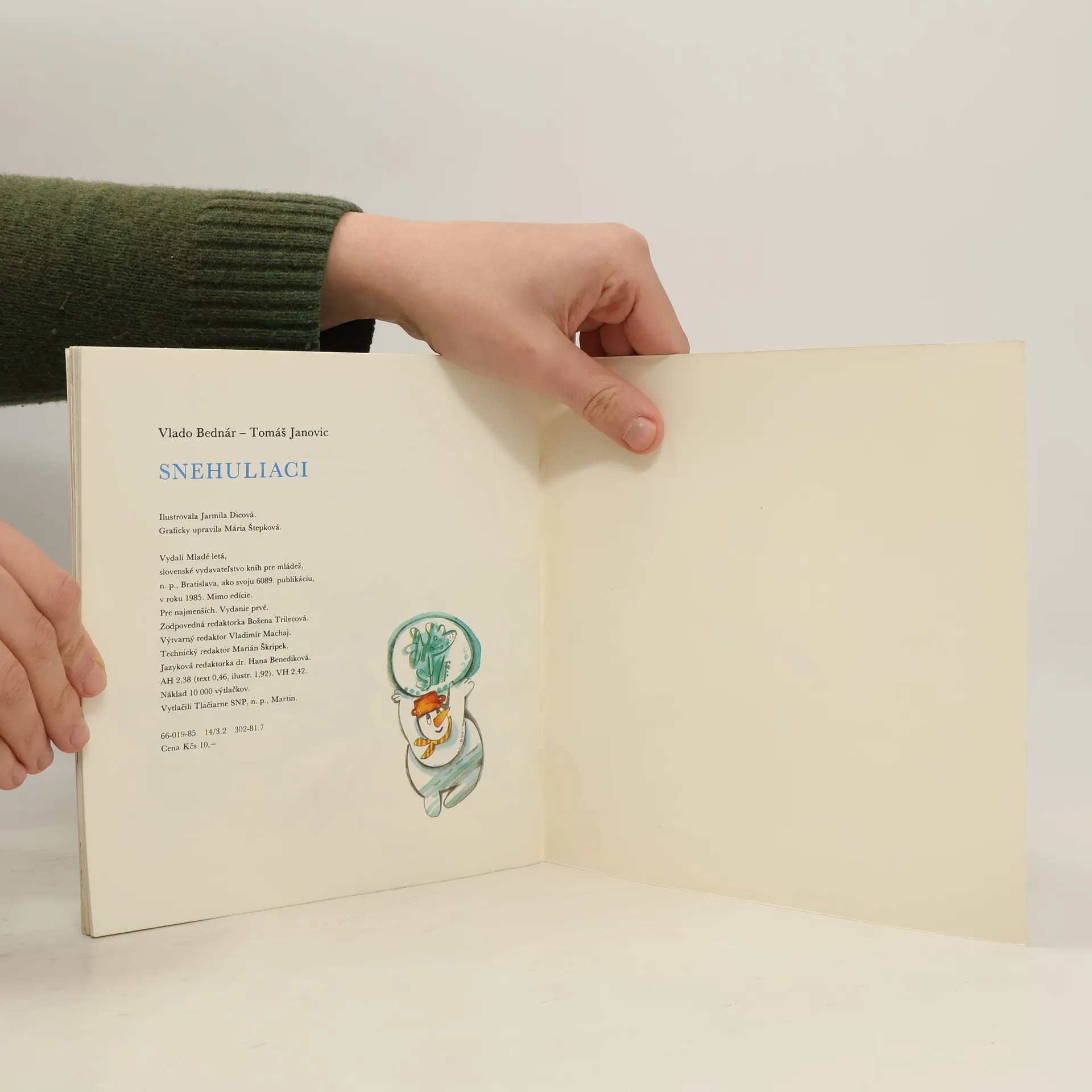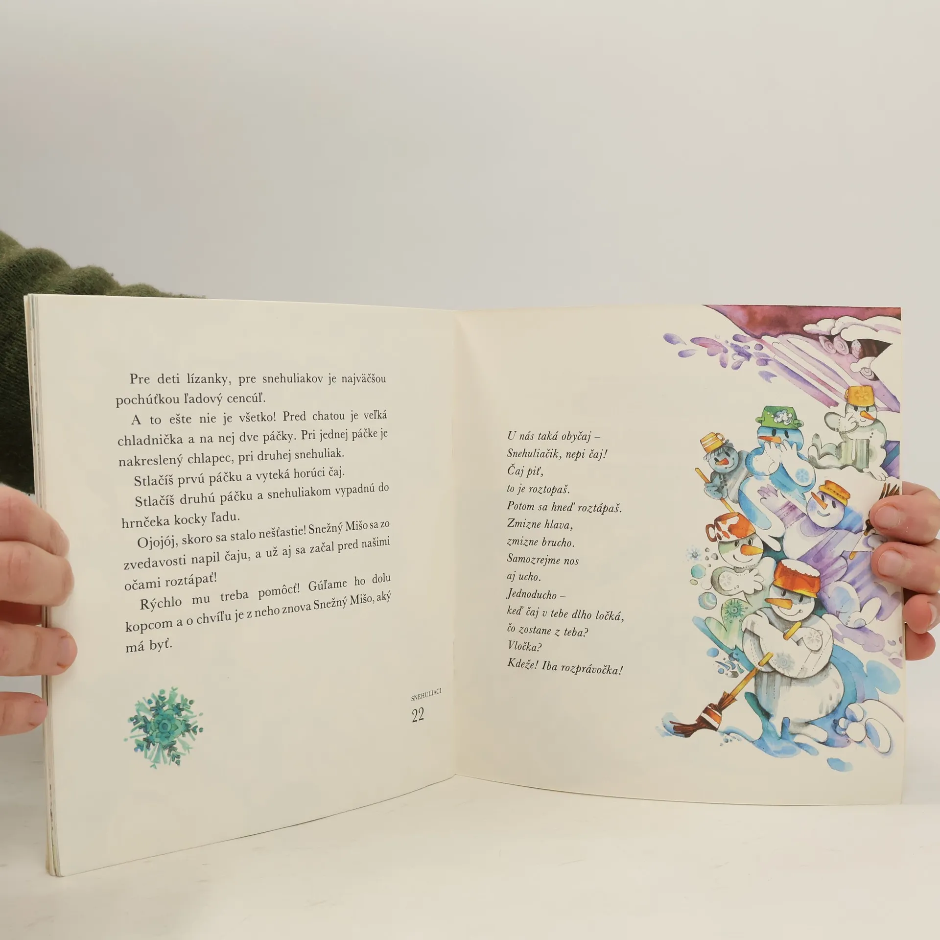 Chlapci z dediny postavili na lúke snehuliaka. Takého obyčajného, s mrkvou miesto nosa, deravým hrncom na hlave a uhlíkmi miesto očí. Aj my staviame snehuliaka.Ale nie obyčajného, guľatého. Tato nám nakreslil do snehu tri kocky, a tak staviame kockovitého snehuliaka. Nedarí sa nám to. Niekedy je sneh guľkatý, ten je dobrý na guľatého snehuliaka...