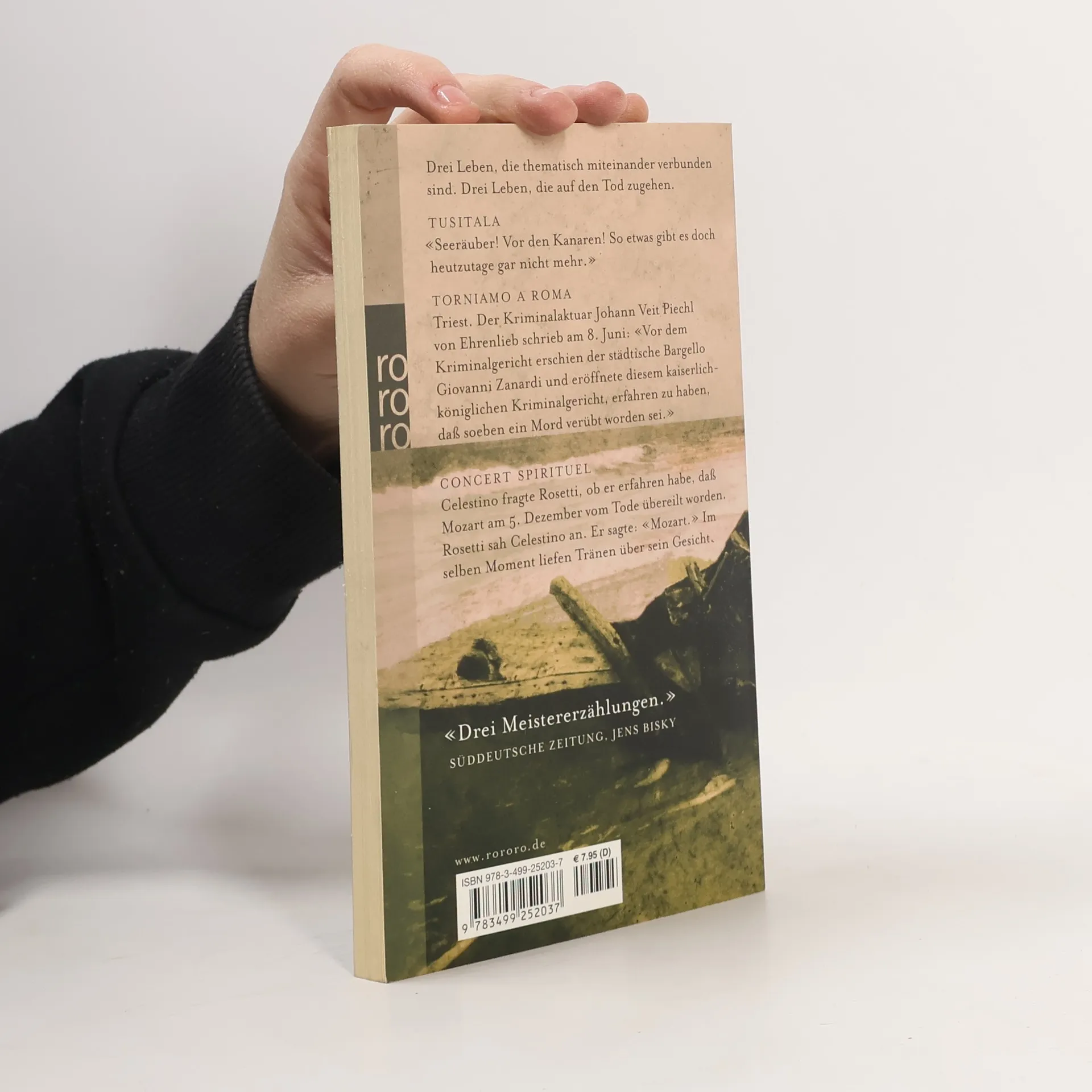 Drei Leben, die thematisch miteinander verbunden sind. Drei Leben, die auf den Tod zugehen. TUSITALA «Seeräuber! Vor den Kanaren! So etwas gibt es doch heutzutage gar nicht mehr.» TORNIAMO A ROMA Triest. Der Kriminalaktuar Johann Veit Piechl von Ehrenlieb schrieb am 8. Juni: «Vor dem Krimi-nalgericht erschien der städtische Bargello Giovanni Zanardi und eröffnete diesem kaiserlich-königlichen Kriminalgericht, erfahren zu haben, daß soeben ein Mord verübt worden sei.» CONCERT SPIRITUEL Celestino fragte Rosetti, ob er erfahren habe, daß Mozart am 5. Dezember vom Tode übereilt worden. Rosetti sah Celestino an. Er sagte: «Mozart.» Im selben Moment liefen Tränen über sein Gesicht.