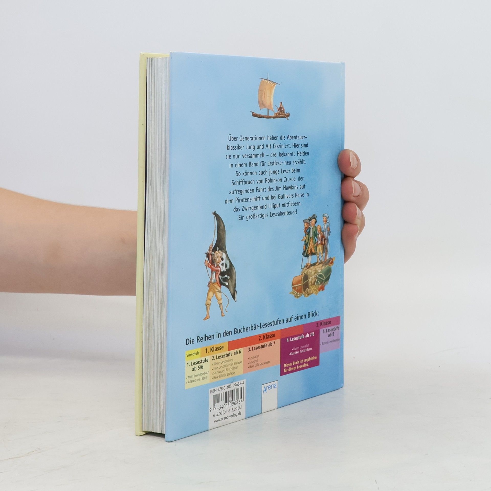 - Robinson Crusoe - Die Schatzinsel - Gullivers Reisen Über Jahrhunderte haben die Abenteuer-Klassiker Jung und Alt fasziniert. Hier sind sie nun versammelt - drei bekannte Helden in einem Band für Erstleser neu erzählt. So können auch junge Leser bei dem Schiffbruch von Robinson Crusoe, der aufregenden Fahrt des Jim Hawkins auf dem Piratenschiff und bei Gullivers Reise in das Zwergenland Liliput mitfiebern.
