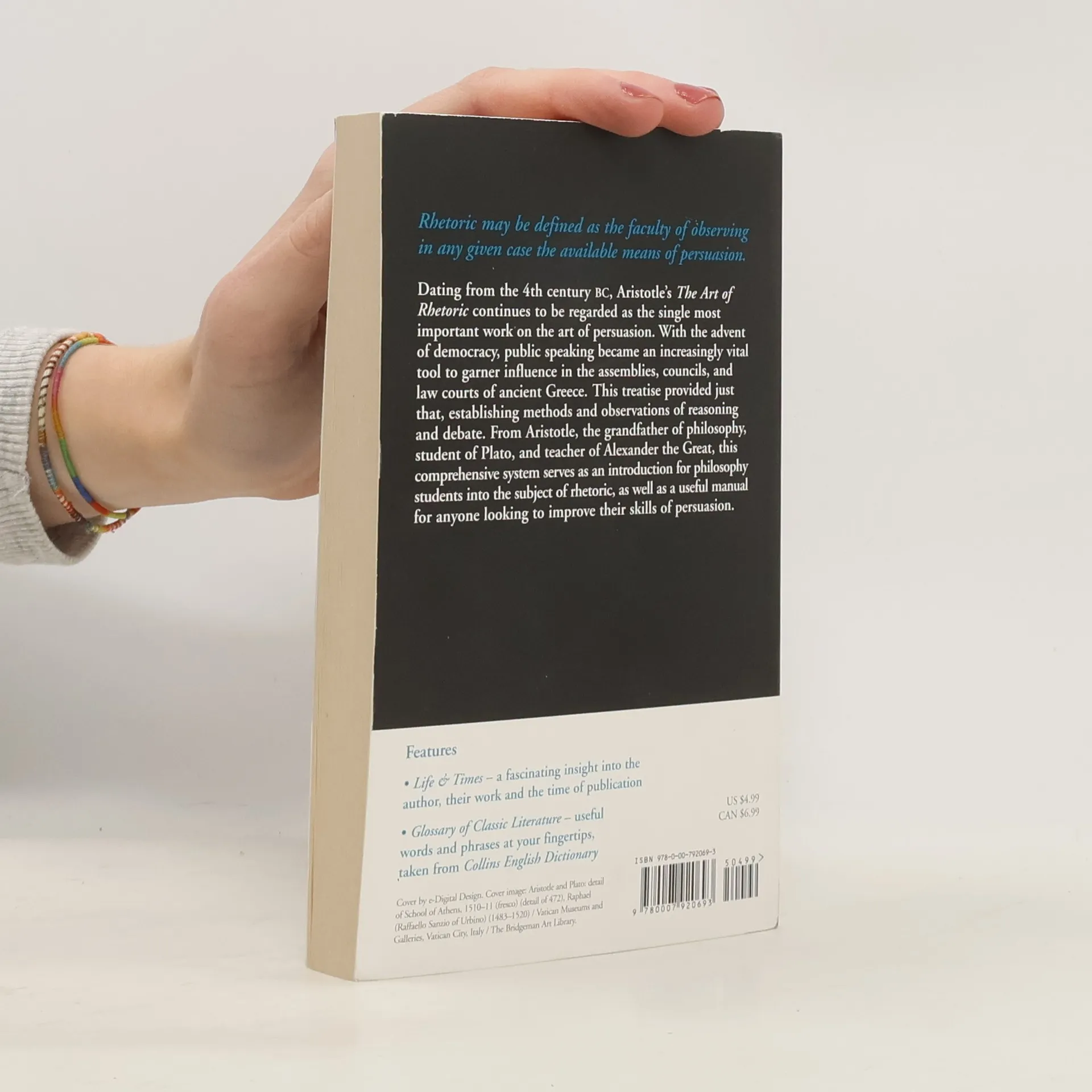 HarperCollins is proud to present its incredible range of best-loved, essential classics... Despite dating from the 4th century BC, The Art of Rhetoric continues to be regarded by many as the single most important work on the art of persuasion. As democracy began emerging in 5th-century Athens, public speaking and debate became an increasingly important tool to garner influence in the assemblies, councils, and law courts of ancient Greece. In response to this, both politicians and ordinary citizens became desperate to learn greater skills in this area, as well as the philosophy behind it. This treatise was one of the first to provide just that, establishing methods and observations of informal reasoning and style, and has continued to be hugely influential on public speaking and philosophy today. Aristotle, the grandfather of philosophy, student of Plato, and teacher of Alexander the Great, was one of the first people to create a comprehensive system of philosophy, encompassing logic, morality, aesthetics, politics, ethics, and science. Although written over 2,000 years ago, The Art of Rhetoric remains a comprehensive introduction for philosophy students into the subject of rhetoric, as well as a useful manual for anyone today looking to improve their oratory skills of persuasion.