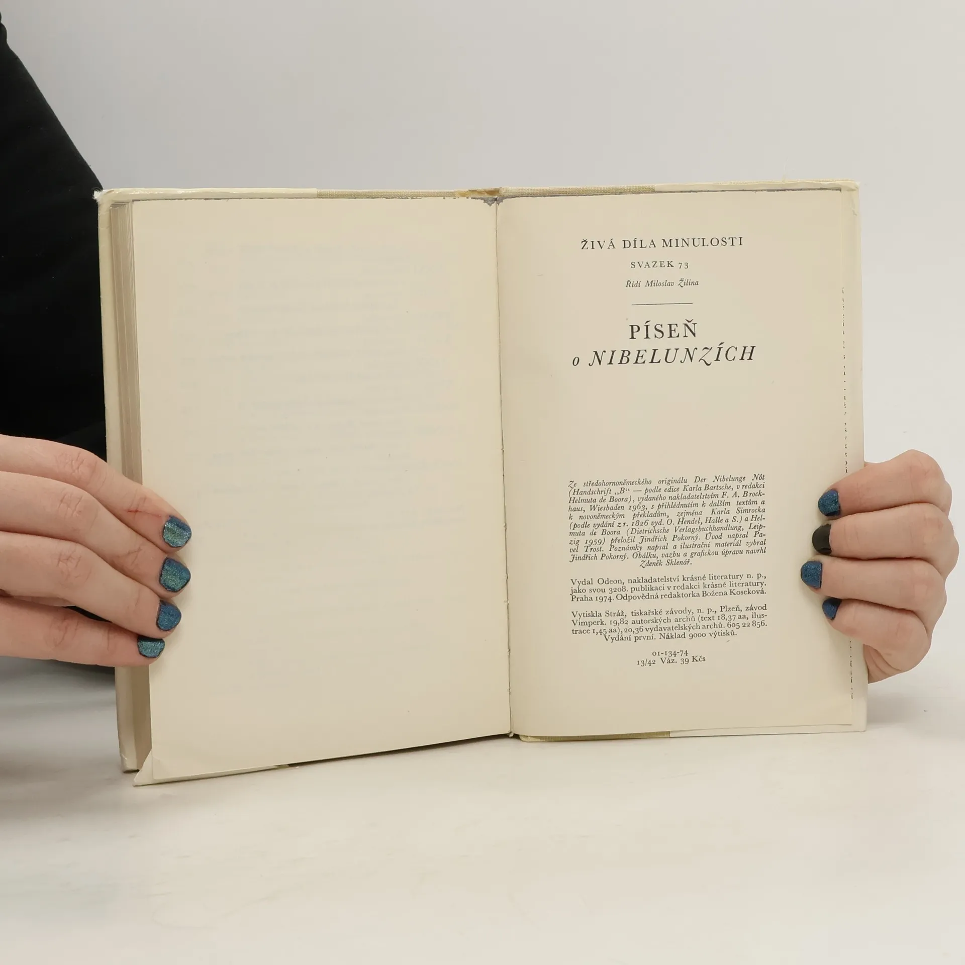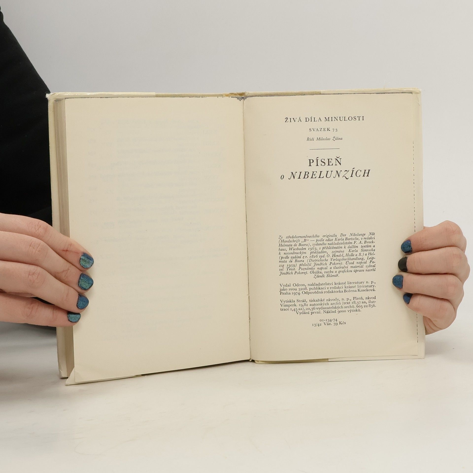 První básnický překlad rytířského eposu štaufské doby, nejslavnější literární památky německé středověké literatury, kterou milovali romantikové a vážili si jí Goethe i Heine. Dílo, jež bylo objeveno v 2. polovině 18. století, stvořil neznámý autor na počátku 13. století, a to tak, že do rytířské dvorské kultury přenesl látku z doby kolem stěhování národů za Attilova vpádu. Knihu doplňuje bohatý poznámkový aparát a fotografický materiál.