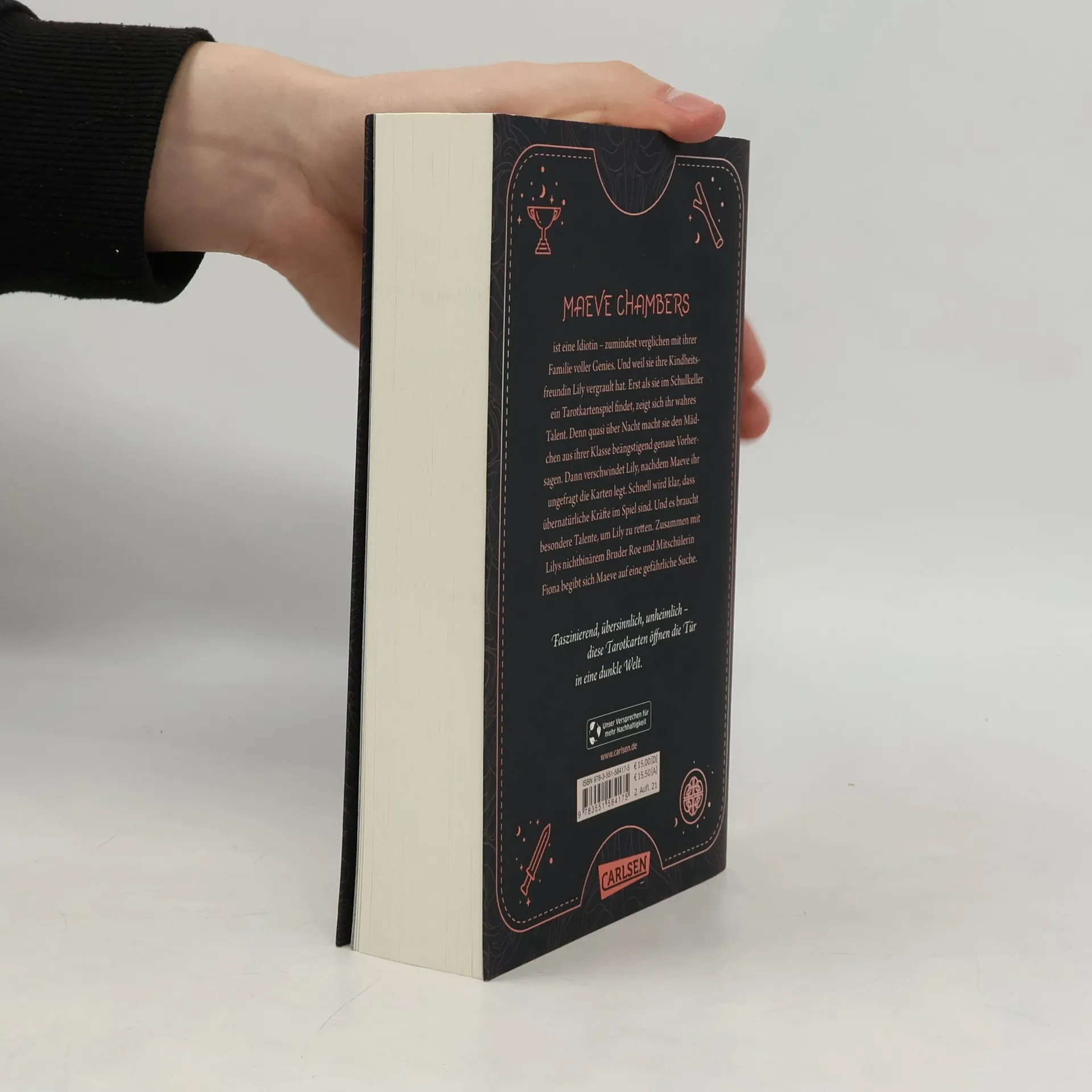 Faszinierend, übersinnlich, unheimlich - diese Tarotkarten öffnen die Tür in eine dunkle Welt. Maeve Chambers ist eine Idiotin – zumindest verglichen mit ihrer Familie voller Genies. Und weil sie ihre Kindheitsfreundin Lily vergrault hat. Erst als sie im Schulkeller ein Tarotkartenspiel findet, zeigt sich ihr wahres Talent. Denn quasi über Nacht macht sie den Mädchen aus ihrer Klasse beängstigend genaue Vorhersagen. Dann verschwindet Lily, nachdem Maeve ihr ungefragt die Karten legt. Schnell wird klar, dass übernatürliche Kräfte im Spiel sind. Und es braucht besondere Talente, um Lily zu retten. Zusammen mit Lilys nichtbinärem Bruder Roe und Mitschülerin Fiona begibt sich Maeve auf eine gefährliche Suche. »Stürmisch und wild und einfach gut!« Melinda Salisbury Alle Bände der Urban-Fantasy-Serie »All Our Hidden Gifts«: All Our Hidden Gifts 1 – Die Macht der Karten All Our Hidden Gifts 2 – Die Kraft der Talente All Our Hidden Gifts 3 – Das Haus der Magie