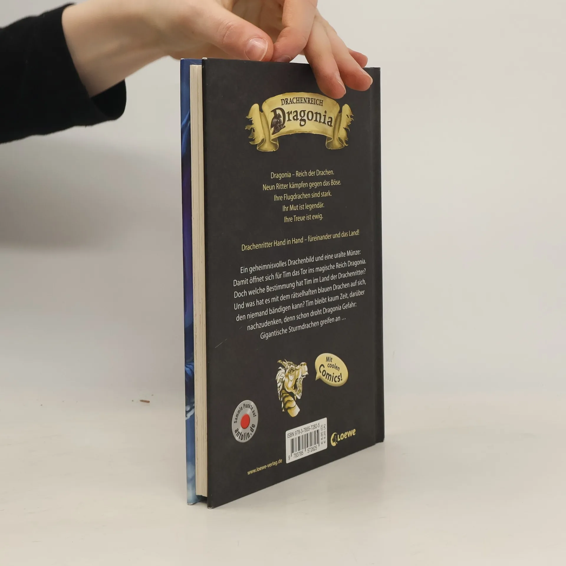 Dragonia – Reich der Drachen. Neun Ritter kämpfen gegen das Böse. Ihre Flugdrachen sind stark. Ihr Mut ist legendär. Ihre Treue ist ewig. Drachenritter Hand in Hand – füreinander und das Land! Ein geheimnisvolles Drachenbild und eine uralte Münze: Damit öffnet sich für Tim das Tor ins magische Reich Dragonia. Doch welche Bestimmung hat Tim im Land der Drachenritter? Und was hat es mit dem rätselhaften blauen Drachen auf sich, den niemand bändigen kann? Tim bleibt kaum Zeit, darüber nachzudenken, denn schon droht Dragonia Gefahr: Gigantische Sturmdrachen greifen an ...