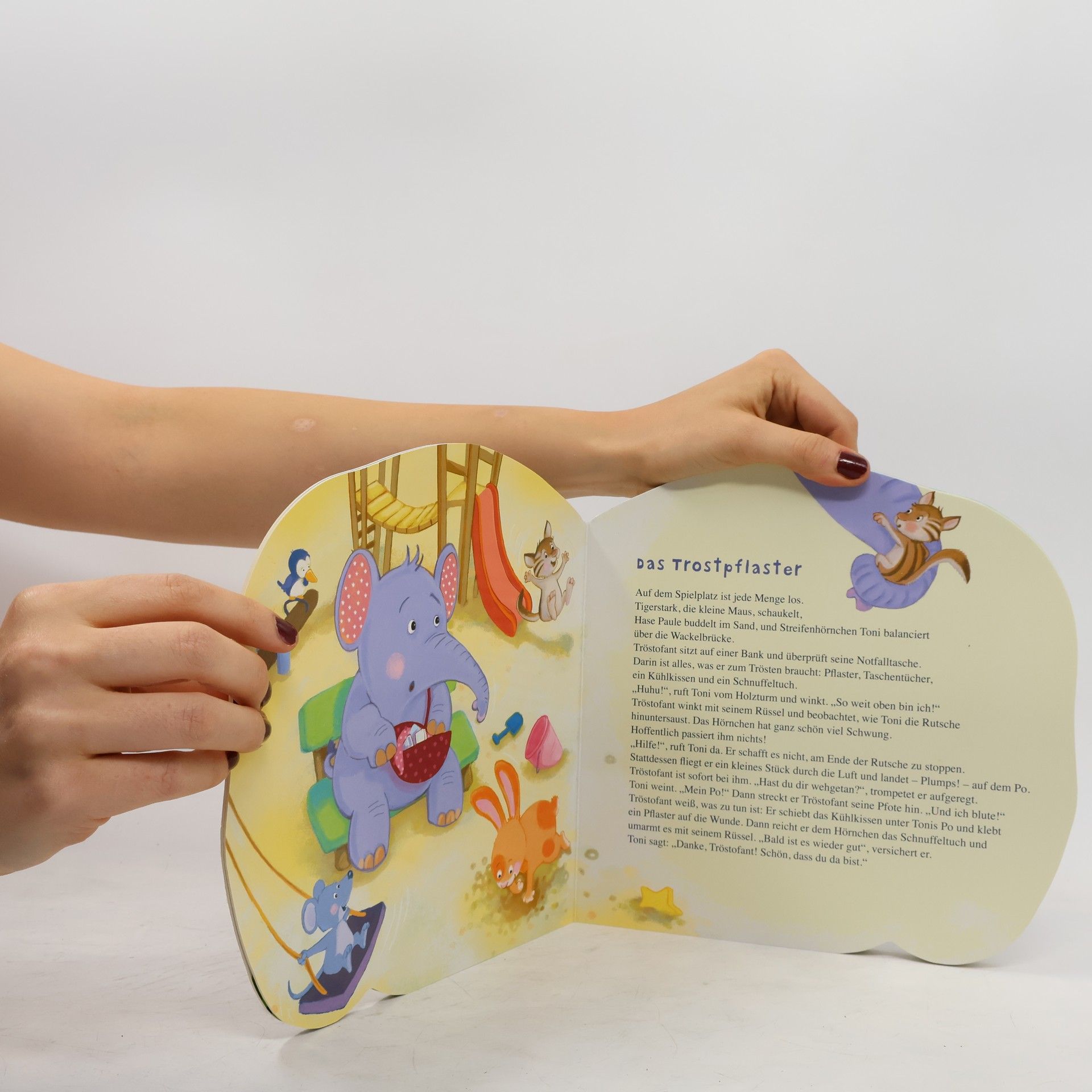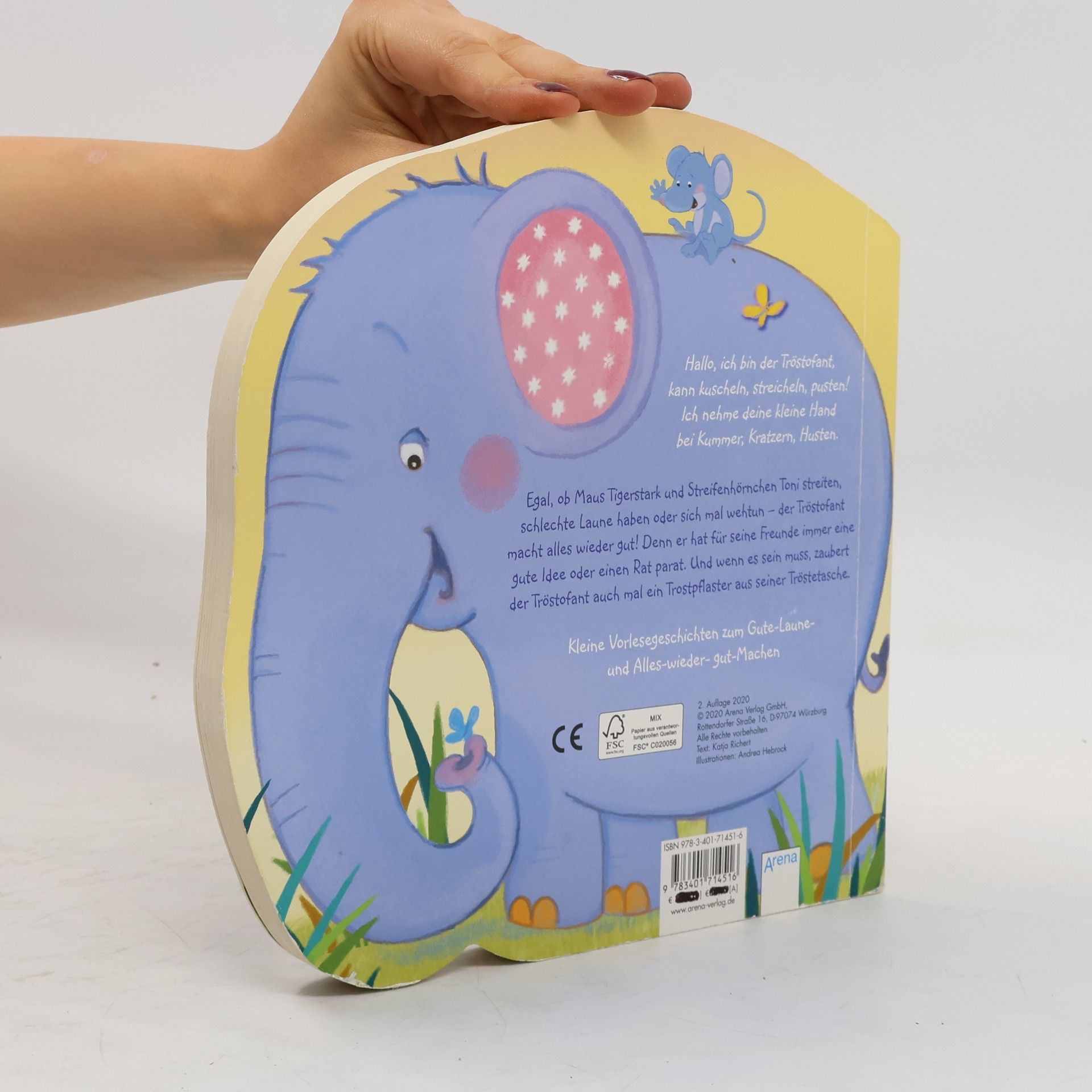 Ein wunderschönes Pappbilderbuch, das durch eine außergewöhnliche Ausstattung begeistert: mit Formstanzung und Elefantenohr aus Plüsch! Egal, ob Maus Tigerstark und Streifenhörnchen Toni streiten, schlecht gelaunt sind oder sich wehgetan haben - der Tröstofant macht alles wieder gut! Denn er hat für seine Freunde immer eine gute Idee oder einen Rat parat. Und wenn es sein muss, zaubert der Tröstofant auch mal ein Trostpflaster aus seiner Tröstetasche. Kleine Vorlesegeschichten und lustige Gedichte trösten Kinder ab 2 Jahren und machen ganz schnell wieder gute Laune.