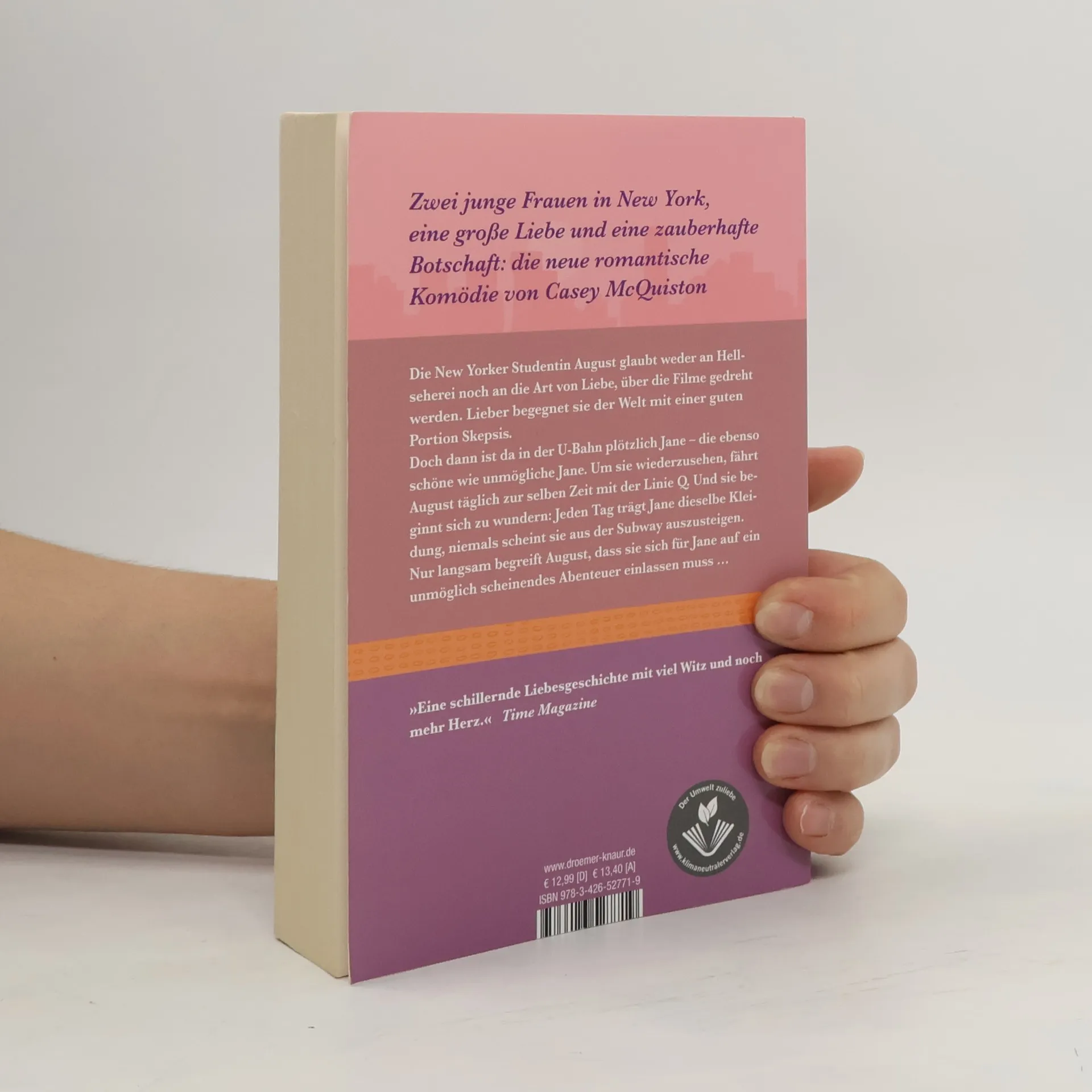 Zwei junge Frauen in New York, eine große Liebe und eine zauberhafte Botschaft: die neue unkonventionelle romantische Komödie von Casey McQuiston Die New Yorker Studentin August glaubt weder an Hellseherei, noch an die Art von Liebe, über die Filme gedreht werden. Und ganz sicher glaubt sie nicht, dass ihre WG voller liebenswerter Nerds daran etwas ändern wird – oder gar ihre Nachtschichten in einem Pancake House, das seit den 70er Jahren Kultstatus genießt. Doch dann ist da in der U-Bahn plötzlich Jane – die ebenso schöne wie unmögliche Jane. Um sie wiederzusehen, fährt August täglich zur selben Zeit mit der Linie Q. Und sie beginnt sich zu wundern: Jeden Tag trägt Jane dieselbe Kleidung, niemals scheint sie aus der U-Bahn auszusteigen. Nur langsam begreift August, dass sie sich für Jane auf ein unmöglich scheinendes Abenteuer einlassen muss … »Casey McQuiston gelingt es wieder, eine Welt zu erschaffen, die man am liebsten gar nicht mehr verlassen möchte – voller wunderbarer Charaktere und mit einem queeren Paar, das man sofort ins Herz schließt.« Meryl Wilsner Wenn die Liebe U-Bahn fährt: einfühlsam, humorvoll und ein kleines bisschen übersinnlich begeistert Casey McQuiston, New-York-Times-Bestseller-Autor*in von »Royal Blue«, auch mit ihrer zweiten romantischen Komödie.