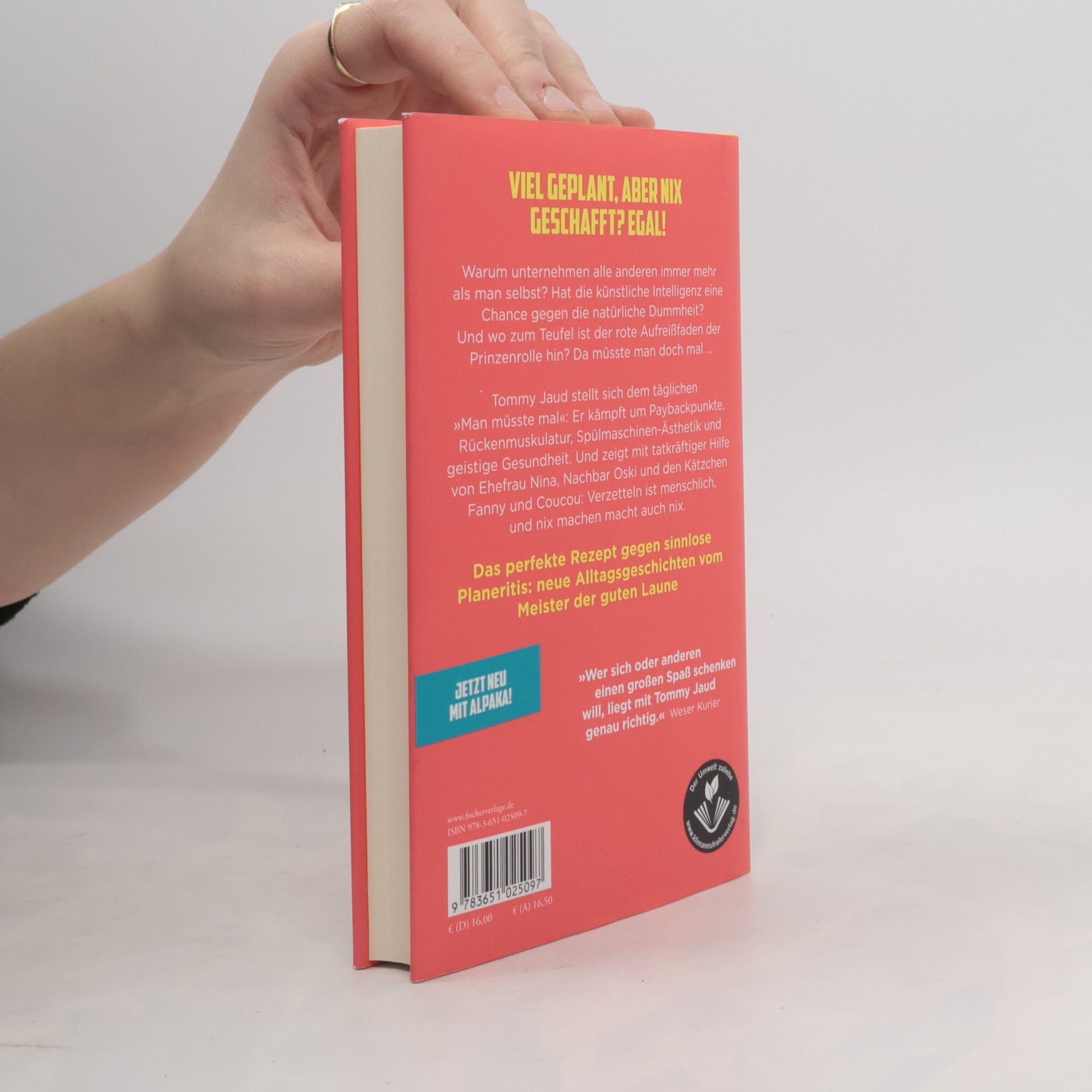 »Wer sich oder anderen einen großen Spaß schenken will, liegt mit Tommy Jaud genau richtig.« Weser Kurier Warum unternehmen alle anderen immer mehr als man selbst? Hat die künstliche Intelligenz eine Chance gegen die natürliche Dummheit? Und wo zum Teufel ist der rote Aufreißfaden der Prinzenrolle hin? Da müsste man doch mal ... Tommy Jaud stellt sich dem täglichen »Man müsste mal«: Er kämpft um Paybackpunkte, Rückenmuskulatur, Spülmaschinen-Ästhetik und geistige Gesundheit. Und zeigt mit tatkräftiger Hilfe von Ehefrau Nina, Nachbar Oski und den Britisch-Kurzhaar-Kätzchen Fanny und Coucou: Verzetteln ist menschlich, und nix machen macht auch nix. Neue Alltagsgeschichten vom Meister der guten Laune. Jetzt mit der Alpaka-Formel! »Der perfekte Stimmungsheber.« Hörzu