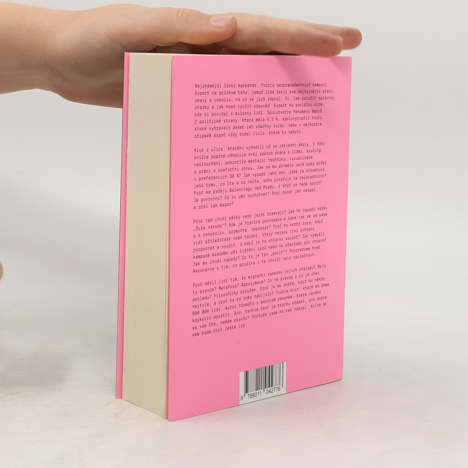 Nejznámější český marketér a tvůrce bezprecedentních kampaní odhaluje svůj jedinečný přístup k práci s lidmi. Jako expert na průzkum trhu získal důvěru a tajemství milionů, ví, jak klást správné otázky a využít odpovědi. Je spolutvůrcem úspěšného hnutí, které vyhrálo volby po dobu deseti let. Přestože má za sebou těžké dětství, jeho metody koučingu, naslouchání a pokročilé mentální techniky mu umožnily dosáhnout úspěchu. Jak se mu podařilo udržet preference 30 %? Jak vypadá jeho den a struktura týmu? Co čte a koho považuje za inspiraci? Proč preferuje Balenciagu před Pradou? Jak se mu rodí nápady, a co znamená „pocit“? Rezonance s tím, co prožívá celá společnost, je klíčová. Jaké provokace zvolil a proč mu nevadí kritika? Je autorem knih, které oslovují 800 000 lidí, a formátů s masovým zásahem. Tento text je přepal, ale čtivý, a kniha slibuje ještě lepší zážitek.