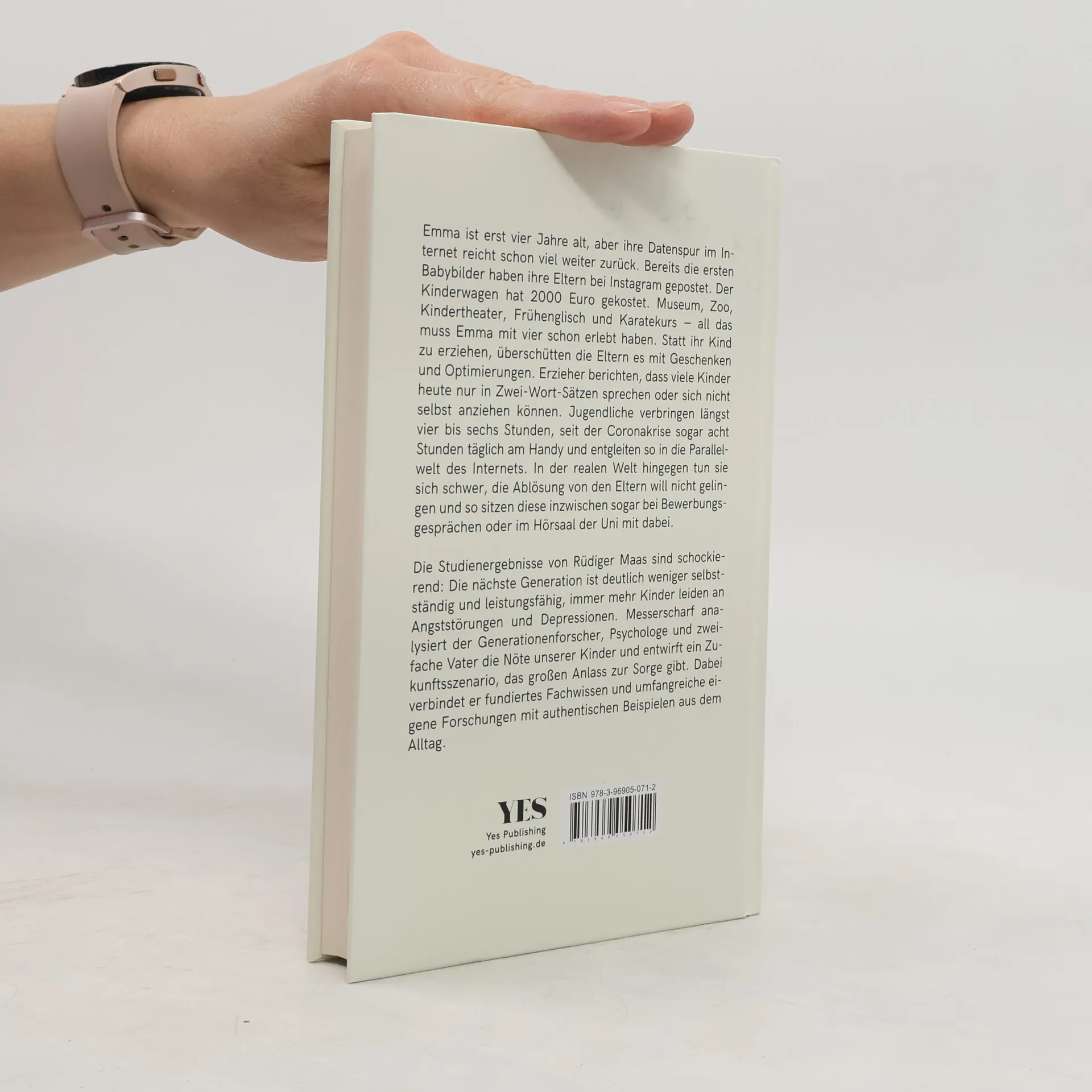 Emma ist erst vier Jahre alt, aber ihre Datenspur im Internet reicht schon viel weiter zurück. Bereits das erste Ultraschallbild haben ihre Eltern bei Instagram gepostet. Der Kinderwagen hat 2000 Euro gekostet. Museum, Zoo, Kindertheater, Frühenglisch und Karatekurs – all das muss Emma mit vier schon erlebt haben. Statt ihr Kind zu erziehen, überschütten die Eltern es mit Liebe, Geschenken und Optimierungen. Erzieher berichten, dass viele Kinder heute später trocken werden, nur in 2-Wort-Sätzen sprechen oder sich nicht selbst anziehen können. Jugendliche verbringen längst vier bis sechs Stunden täglich am Handy und entgleiten so in die Parallelwelt des Internets. In der realen Welt hingegen tun sie sich schwer, die Ablösung von den Eltern will nicht gelingen und so sitzen diese inzwischen sogar bei Bewerbungsgesprächen oder im Hörsaal der Uni mit dabei. Die Studienergebnisse von Rüdiger Maas sind schockierend: Die nächste Generation ist deutlich weniger selbstständig und leistungsfähig, immer mehr Kinder leiden an Angststörungen und Depressionen. Messerscharf analysiert der Generationenforscher, Psychologe und zweifache Vater die Nöte unserer Kinder und entwirft ein Zukunftsszenario, das großen Anlass zur Sorge gibt. Dabei verbindet er fundiertes Fachwissen und umfangreiche eigene Forschungen mit authentischen Beispielen aus dem Alltag.