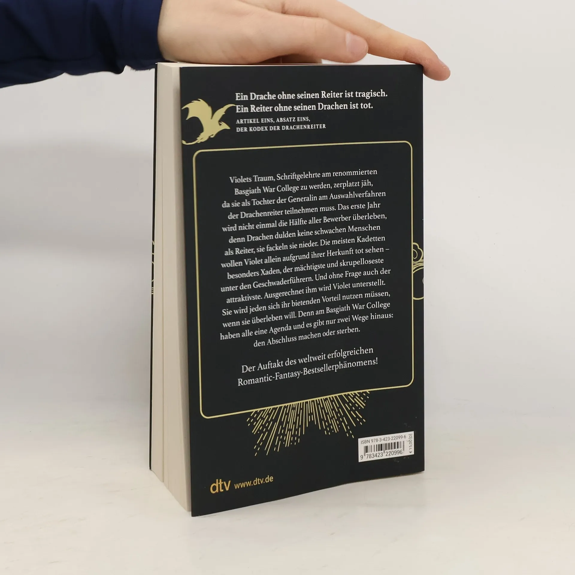 Ein Drache ohne seinen Reiter ist tragisch. Ein Reiter ohne seinen Drachen ist tot.Violets Traum, Schriftgelehrte am renommierten Basgiath War College zu werden, zerplatzt jäh, da sie als Tochter der Generalin am Auswahlverfahren der Drachenreiter teilnehmen muss. Das erste Jahr wird nicht einmal die Hälfte aller Bewerber überleben, denn Drachen binden sich nicht an schwache Menschen, sie fackeln sie nieder. Die meisten Kadetten wollen Violet allein aufgrund ihrer Herkunft niederstrecken – besonders Xaden, der mächtigste und skrupelloseste unter den Geschwaderführern. Und ohne Frage auch der attraktivste. Ausgerechnet ihm wird Violet unterstellt. Sie wird jeden Vorteil nutzen müssen, wenn sie überleben will. Denn am Basgiath War College haben alle eine Agenda und es gibt nur zwei Wege hinaus: den Abschluss machen oder sterben.