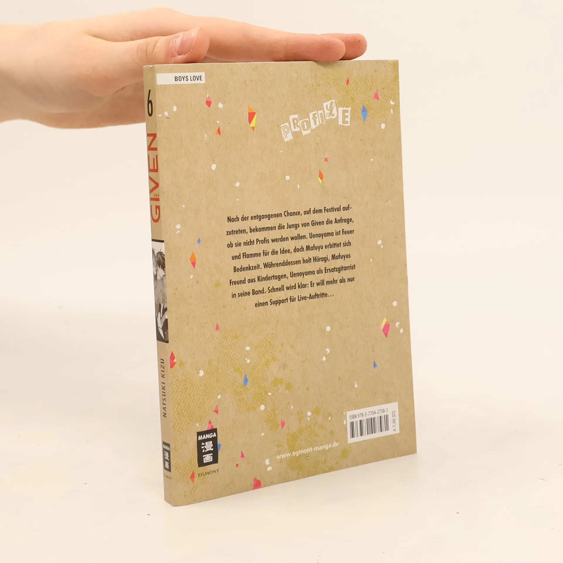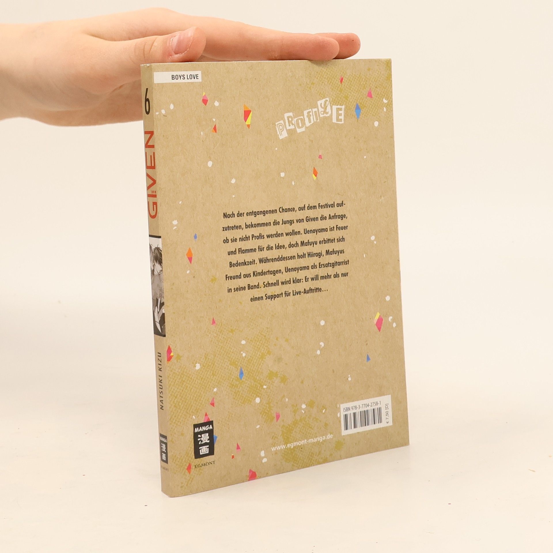GIVEN – Der Rockstar unter den Boys-Love-Mangas! Ein temperamentvoller Gitarrist, ein Schlagzeuger, der Herzen bricht, ein sanfter Bassist und ein talentierter Sänger mit tragischer Vergangenheit – das sind die Mitglieder der Band Given. In neun Bänden darf das Publikum verfolgen, wie große Gefühle und heftige Konflikte sie manchmal auseinandertreiben, aber sie eines immer wieder zusammenführt: die Liebe zur Musik! Inhalt Band 6: Nach der entgangenen Chance, auf dem Festival aufzutreten, bekommen die Jungs von Given die Anfrage, ob sie nicht Profi s werden wollen. Uenoyama ist Feuer und Flamme für die Idee, doch Mafuyu erbittet sich Bedenkzeit. Währenddessen holt Hiiragi, Mafuyus Freund aus Kindertagen, Uenoyama als Ersatzgitarrist in seine Band. Schnell wird klar: Er will mehr als nur einen Support für Live-Auftritte… Ein absolutes Must-read – nicht nur für Boys-Love-Fans!