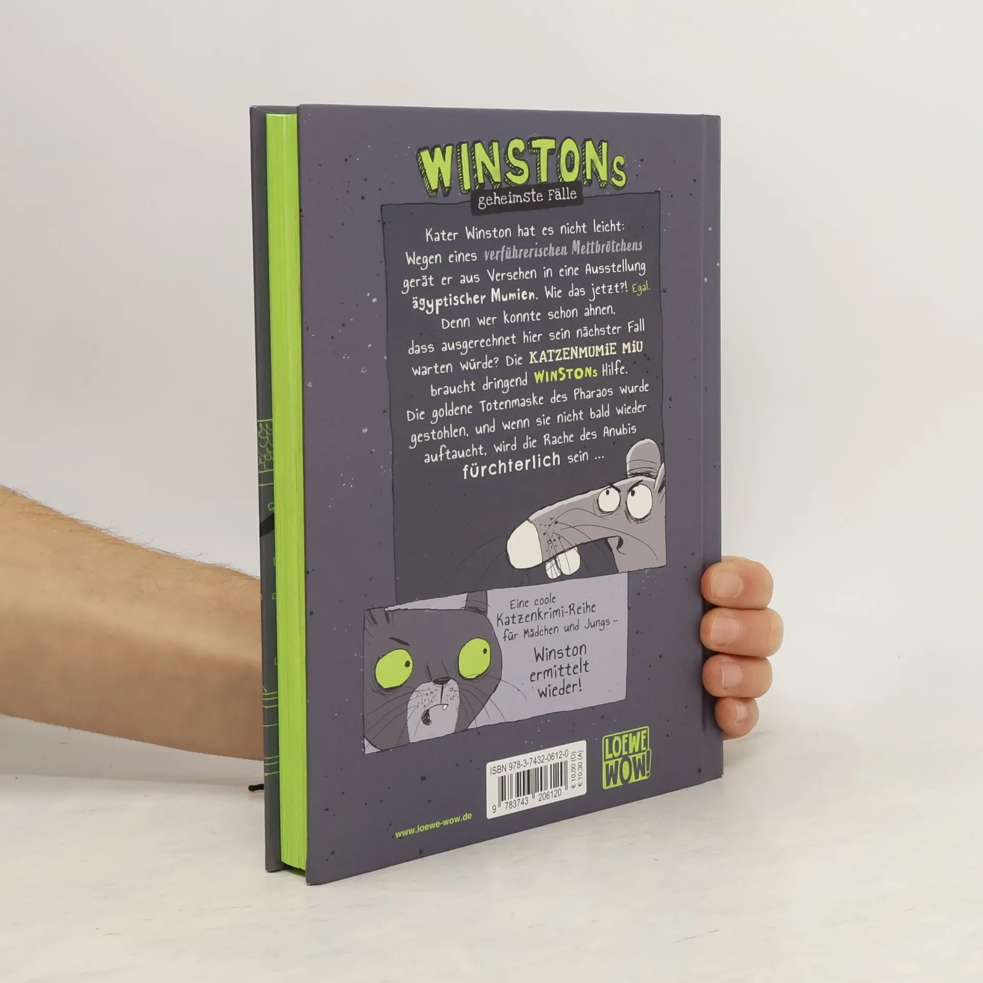 Kater Winston hat es nicht leicht: Ein verführerisches Mettbrötchen führt ihn versehentlich in eine Ausstellung ägyptischer Mumien. Dort erwartet ihn ein unerwarteter Kriminalfall. Die Katzenmumie Miu benötigt dringend Winstons Hilfe, denn die goldene Totenmaske des Pharaos wurde gestohlen. Wenn sie nicht bald zurückgebracht wird, droht die furchtbare Rache des Anubis. Diese spannende und humorvolle Kinderbuchreihe für Mädchen und Jungs ist der Auftakt zu einem neuen Abenteuer für Detektivkater Winston, ergänzt durch coole s/w-Illustrationen, ideal für Kinder ab 10 Jahren und Fans von Frauke Scheunemanns erfolgreicher Reihe. Die Geschichten von Loewe Wow! begeistern mit ihrer einzigartigen Erzählweise und ansprechenden Gestaltung jedes Kind für das Lesen. Auch leseerfahrene Kinder finden schnell neue Lieblingsgeschichten, dank liebevoller Charaktere, die man gerne auf ihren Abenteuern begleitet. Ob spannende Krimis, mitreißende Abenteuergeschichten oder witzige Fantasy – für jedes Kind gibt es das perfekte Wow!-Buch. Loewe Wow!-Bücher sind motivierend, vielfältig und wurden mit dem Lesekompass 2020 & 2021 der Stiftung Lesen ausgezeichnet. 98,9 % der Kinder und Eltern, die ein Loewe Wow!-Buch gelesen haben, würden es weiterempfehlen. Der Titel ist zudem bei Antolin gelistet.