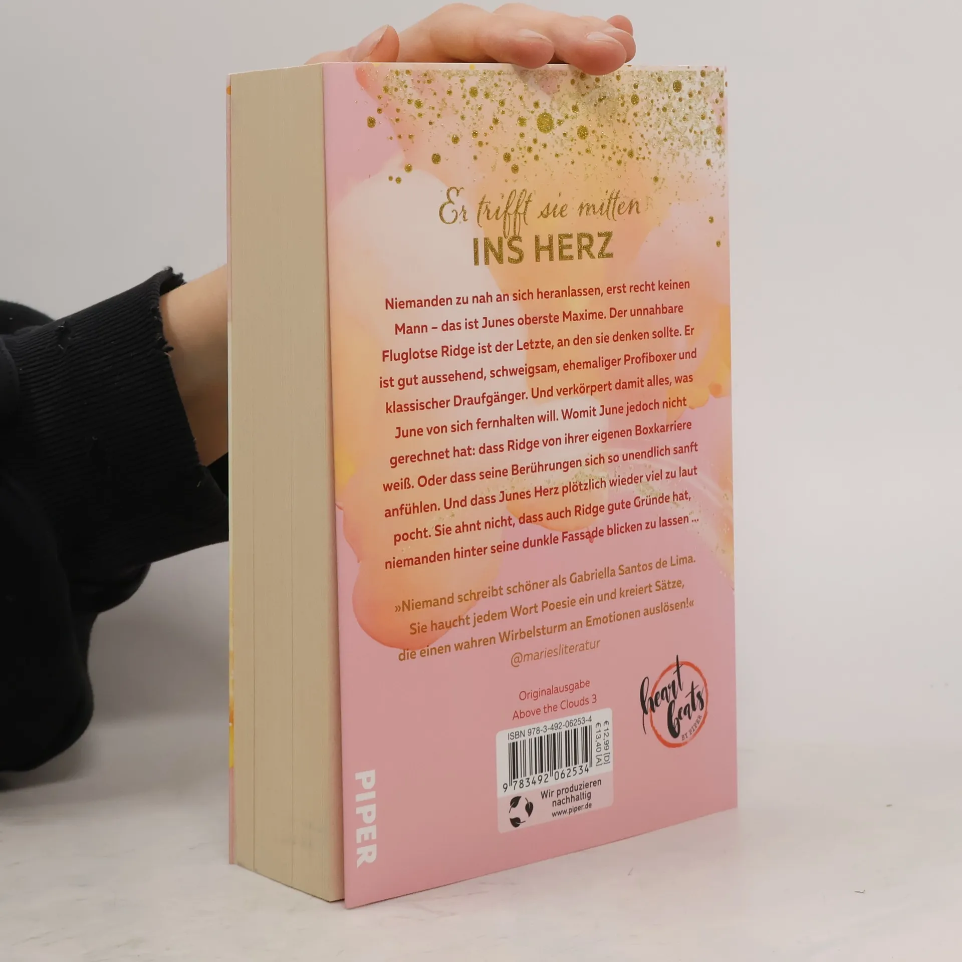 Enjoy Your Flight To Cloud 9 – Destination Love Niemanden zu nah an sich heranlassen, erst recht keinen Mann – das ist Junes oberste Maxime. Der unnahbare Fluglotse Ridge Chapman ist demnach der Letzte, an den sie denken sollte. Er ist gut aussehend, schweigsam, mysteriös, ehemaliger Profiboxer und klassischer Draufgänger. Und verkörpert damit alles, was June unbedingt von sich fernhalten will. Trotzdem ist er der Einzige, der für ihr geheimes Fotoprojekt infrage kommt, denn er schuldet June einen Gefallen. Womit June jedoch nicht gerechnet hat: dass Ridge von ihrer eigenen, bisher verschwiegenen Boxkarriere weiß. Oder dass seine Berührungen sich so unendlich sanft anfühlen. Und dass Junes Herz plötzlich wieder viel zu laut pocht. Dabei ahnt sie nicht, dass auch Ridge mehr als genug gute Gründe hat, niemanden hinter seine dunkle Fassade blicken zu lassen ... »Niemand schreibt schöner als Gabriella Santos de Lima. Sie haucht jedem Wort Poesie ein und kreiert Sätze, die einen wahren Wirbelsturm an Emotionen auslösen. Meine absolute Lieblings-New-Adult-Reihe und Lieblingsautorin, infini.« @mariesliteratur Ready for takeoff! Diese Liebesromane lassen dich nicht wieder los Heb mit der »Above the Clouds«-Trilogie jetzt Richtung Wolke sieben ab. Das sagen die LeserInnen zu »Flaming Clouds« (Band 1) und »Endless Skies« (Band 2): »Dieses Buch ist anders, es ist tief und kraftvoll, ein einziger Herzstillstandmoment. Ich habe mich verliebt – in Olivia, in Nick und in Gabriellas Worte. Schon jetzt ein absolutes Jahreshighlight unter den deutschsprachigen New-Adult-Romanen.« Spiegel-Bestsellerautorin Sarah Sprinz »Dieses Buch ist wie ein Lieblingssong – mitreißend und Gänsehaut verleihend. Ein Meisterwerk unter den New-Adult-Romanen!« @bookspumpkin Gabriella Santos de Lima, geboren 1997 in São Paulo, studiert Kreatives Schreiben in Hildesheim und arbeitet nebenberuflich als Flugbegleiterin. Am liebsten schreibt sie mit Aussicht auf pulsierende Innenstädte mit laut aufgedrehter Musik. Die Autorin ist bereits in den Social Media bekannt, auf Instagram postet sie unter @gabriellasantosdelimaa Buchtipps und Neuigkeiten aus ihrem Leben.