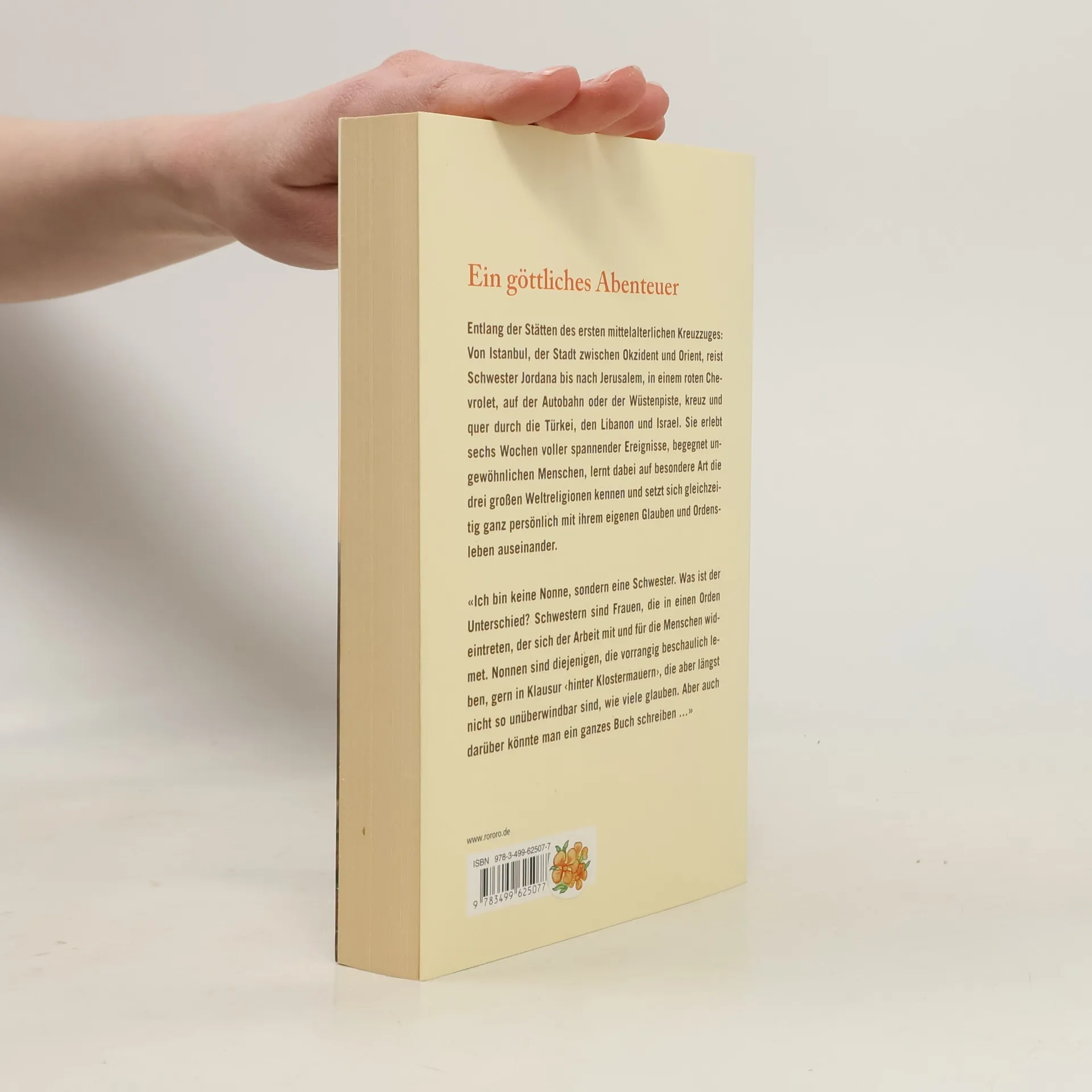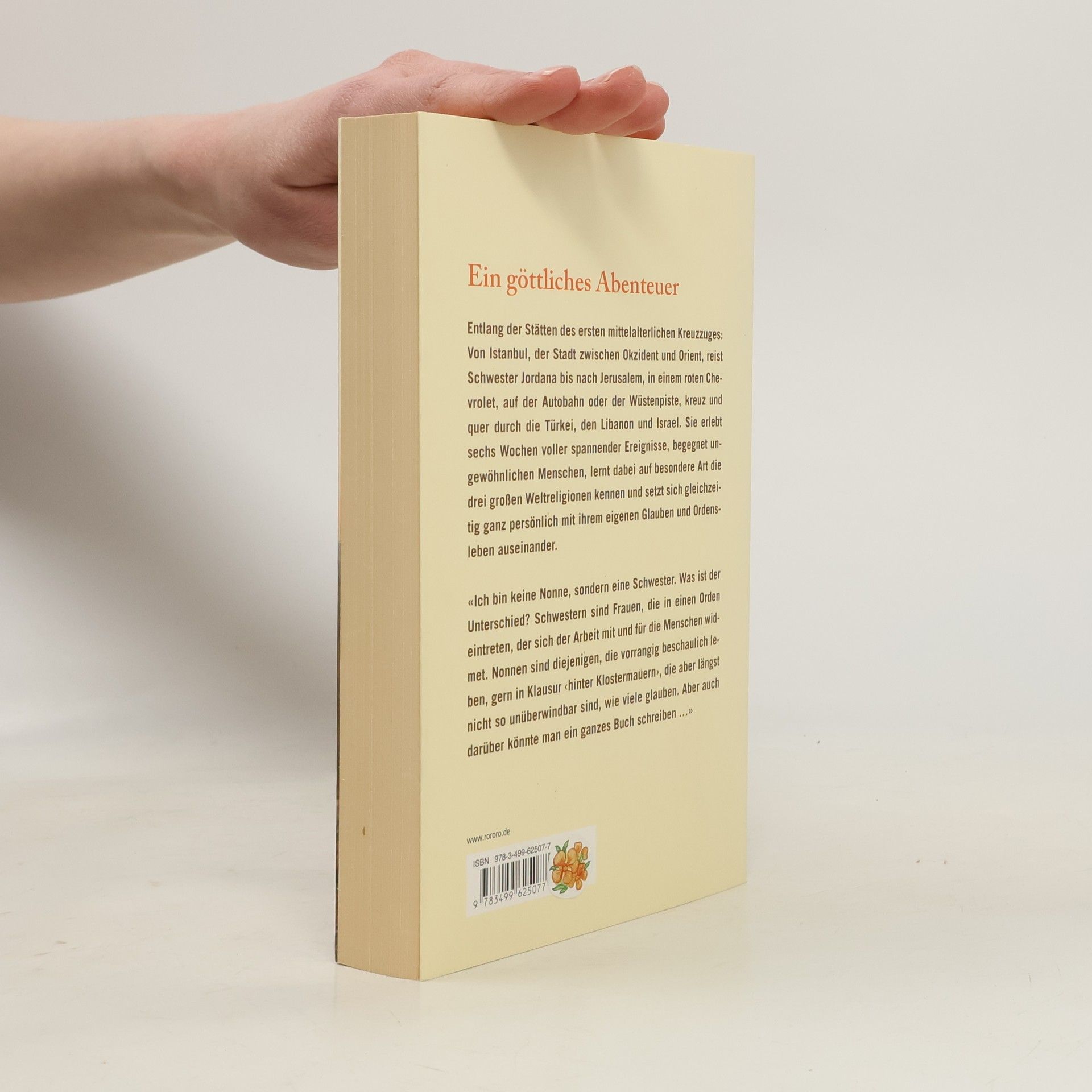 Ein göttliches Abenteuer Entlang der Stätten des ersten mittelalterlichen Kreuzzuges: Von Istanbul, der Stadt zwischen Okzident und Orient, reist Schwester Jordana bis nach Jerusalem, in einem roten Chevrolet, auf der Autobahn oder der Wüstenpiste, kreuz und quer durch die Türkei, den Libanon und Israel. Sie erlebt sechs Wochen voller spannender Ereignisse, begegnet ungewöhnlichen Menschen, lernt dabei auf besondere Art die drei großen Weltreligionen kennen und setzt sich gleichzeitig ganz persönlich mit ihrem eigenen Glauben und Ordensleben auseinander. «Ich bin keine Nonne, sondern eine Schwester. Was ist der Unterschied? Schwestern sind Frauen, die in einen Orden eintreten, der sich der Arbeit mit und für die Menschen widmet. Nonnen sind diejenigen, die vorrangig beschaulich leben, gern in Klausur ‹hinter Klostermauern›, die aber längst nicht so unüberwindbar sind, wie viele glauben. Aber auch darüber könnte man ein ganzes Buch schreiben …»