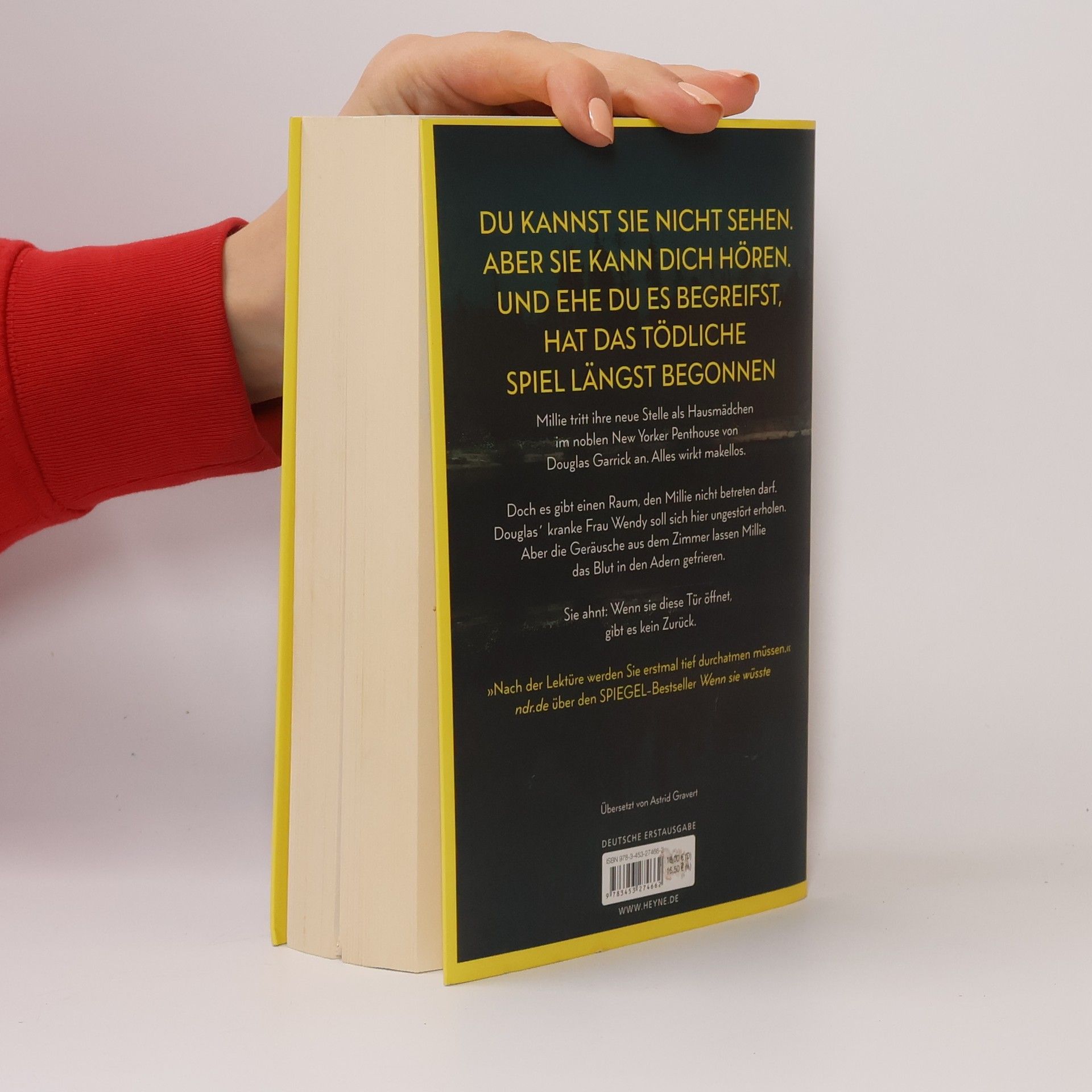 Du kannst sie nicht sehen. Aber sie kann dich hören. Und ehe du es begreifst, hat das tödliche Spiel längst begonnen Millie Calloway hat einen neuen Job. Um sich ihr Studium zu finanzieren, hilft sie einem reichen Paar aus Manhattan im Haushalt. Ihr Arbeitgeber Douglas Garrick wirkt nett, und zum Glück stellt er ihr nicht zu viele Fragen zu ihrer Vergangenheit. Doch warum darf Millie nicht mit seiner Frau Wendy sprechen? Was bedeuten das Weinen, das sie aus dem verschlossenen Zimmer hört, und die Blutflecke auf Wendys Kleidung? Ist Douglas in Wahrheit nicht der fürsorgliche Ehemann, der er vorgibt zu sein? Millie weiß nur eins: Sie muss Wendy helfen. Auch wenn sie damit riskiert, dass ihr dunkelstes Geheimnis doch noch ans Licht kommt.