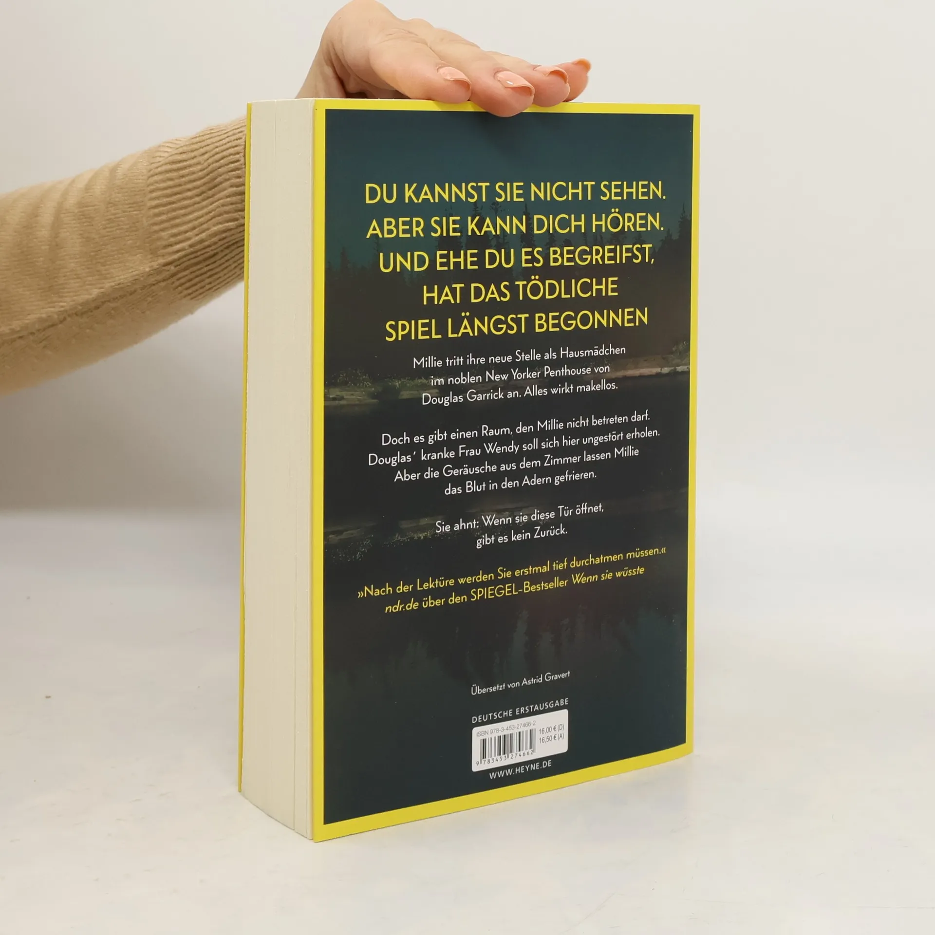 Du kannst sie nicht sehen. Aber sie kann dich hören. Und ehe du es begreifst, hat das tödliche Spiel längst begonnen Millie Calloway hat einen neuen Job. Um sich ihr Studium zu finanzieren, hilft sie einem reichen Paar aus Manhattan im Haushalt. Ihr Arbeitgeber Douglas Garrick wirkt nett, und zum Glück stellt er ihr nicht zu viele Fragen zu ihrer Vergangenheit. Doch warum darf Millie nicht mit seiner Frau Wendy sprechen? Was bedeuten das Weinen, das sie aus dem verschlossenen Zimmer hört, und die Blutflecke auf Wendys Kleidung? Ist Douglas in Wahrheit nicht der fürsorgliche Ehemann, der er vorgibt zu sein? Millie weiß nur eins: Sie muss Wendy helfen. Auch wenn sie damit riskiert, dass ihr dunkelstes Geheimnis doch noch ans Licht kommt.