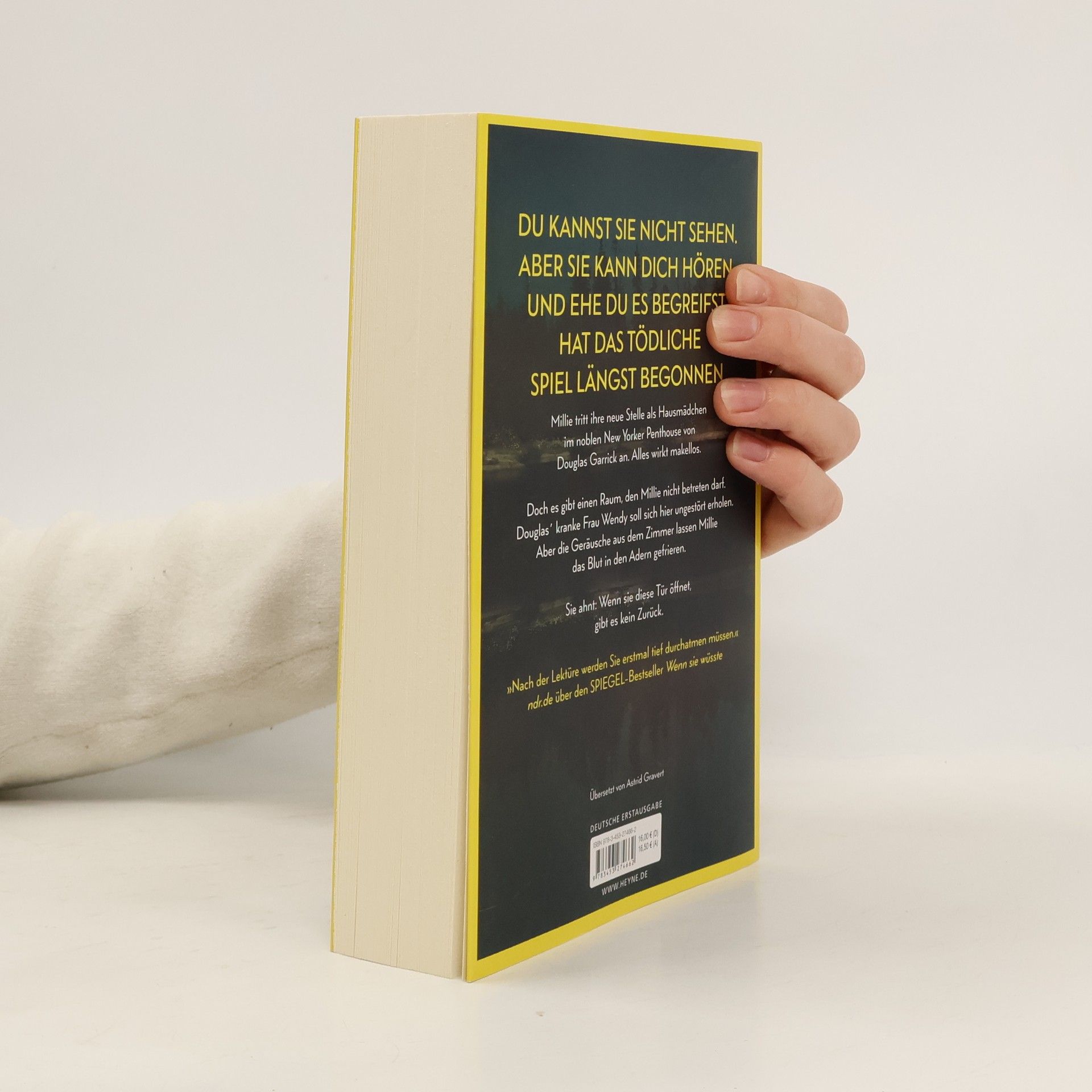 Du kannst sie nicht sehen. Aber sie kann dich hören. Und ehe du es begreifst, hat das tödliche Spiel längst begonnen Millie Calloway hat einen neuen Job. Um sich ihr Studium zu finanzieren, hilft sie einem reichen Paar aus Manhattan im Haushalt. Ihr Arbeitgeber Douglas Garrick wirkt nett, und zum Glück stellt er ihr nicht zu viele Fragen zu ihrer Vergangenheit. Doch warum darf Millie nicht mit seiner Frau Wendy sprechen? Was bedeuten das Weinen, das sie aus dem verschlossenen Zimmer hört, und die Blutflecke auf Wendys Kleidung? Ist Douglas in Wahrheit nicht der fürsorgliche Ehemann, der er vorgibt zu sein? Millie weiß nur eins: Sie muss Wendy helfen. Auch wenn sie damit riskiert, dass ihr dunkelstes Geheimnis doch noch ans Licht kommt.