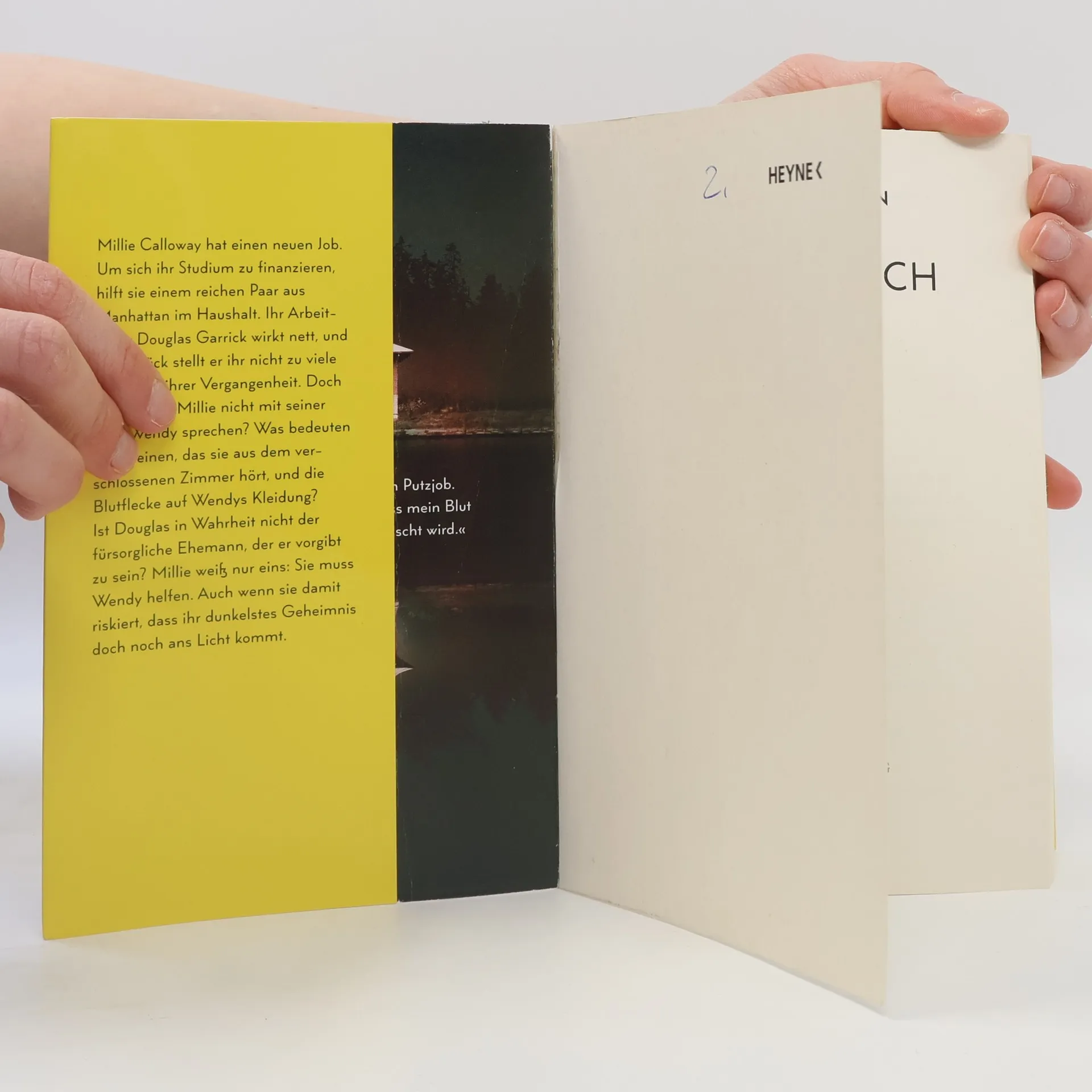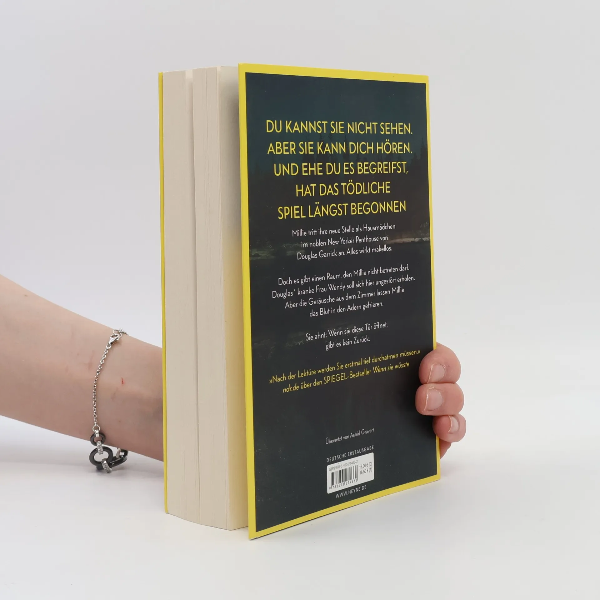 Du kannst sie nicht sehen. Aber sie kann dich hören. Und ehe du es begreifst, hat das tödliche Spiel längst begonnen Millie Calloway hat einen neuen Job. Um sich ihr Studium zu finanzieren, hilft sie einem reichen Paar aus Manhattan im Haushalt. Ihr Arbeitgeber Douglas Garrick wirkt nett, und zum Glück stellt er ihr nicht zu viele Fragen zu ihrer Vergangenheit. Doch warum darf Millie nicht mit seiner Frau Wendy sprechen? Was bedeuten das Weinen, das sie aus dem verschlossenen Zimmer hört, und die Blutflecke auf Wendys Kleidung? Ist Douglas in Wahrheit nicht der fürsorgliche Ehemann, der er vorgibt zu sein? Millie weiß nur eins: Sie muss Wendy helfen. Auch wenn sie damit riskiert, dass ihr dunkelstes Geheimnis doch noch ans Licht kommt.