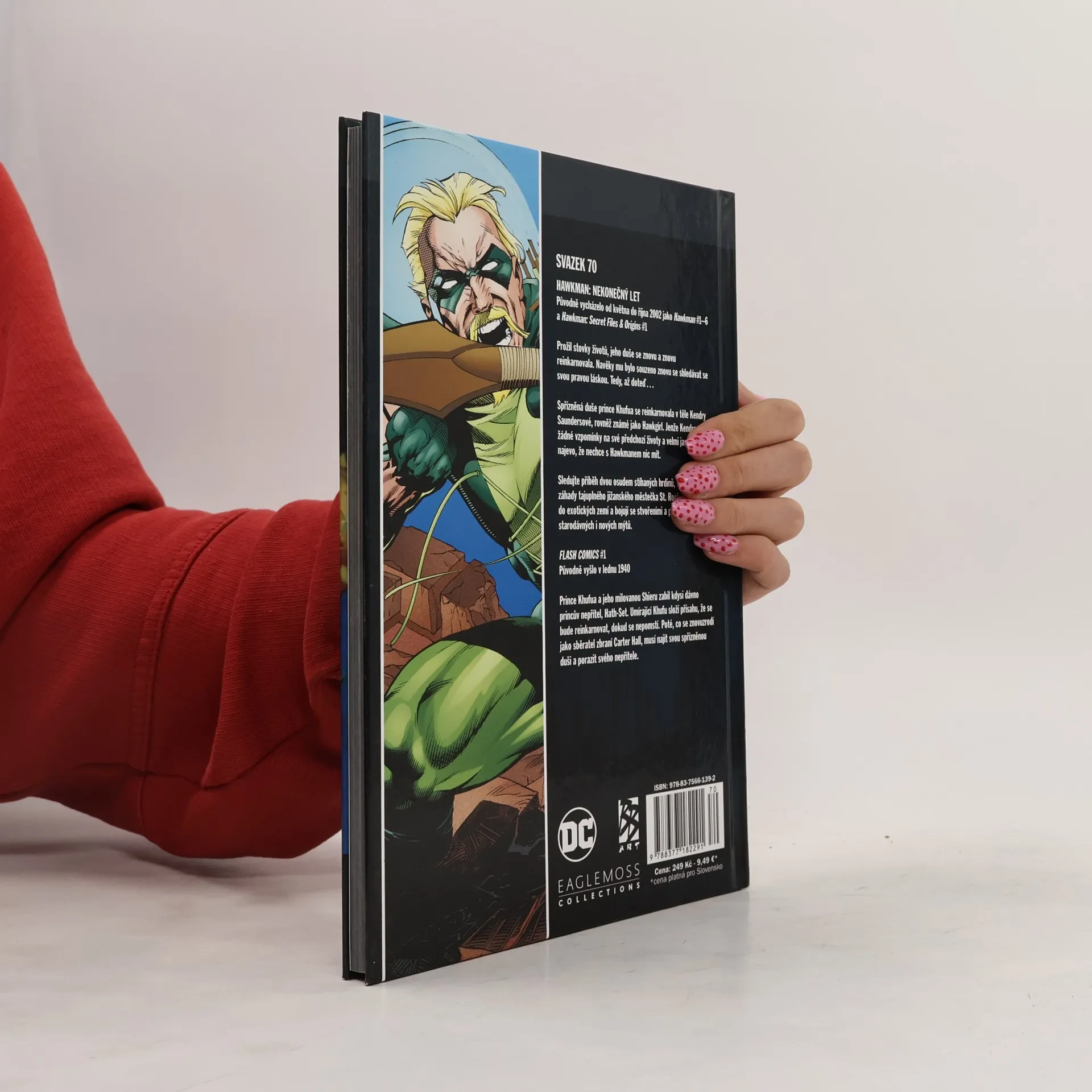 HAWKMAN: NEKONEČNÝ LET Původně vycházelo od května do října 2002 jako Hawkman #1-6 a Hawkman: Secret Files and Origins #1 Prožil stovky životů, jeho duše se znovu a znovu reinkarnovala. Navěky mu bylo souzeno znovu se shledávat se svou pravou láskou. Tedy, až doteď... Spřížněná duše prince Khufua se reinkarnovala v těle Kendry Saundersové, rovněž známé jako Hawkgirl. Jenže Kendra nemá žádné vzpomínky na své předchozí životy a velmi jasně dává najevo, že nechce s Hawkmanem nic mít. Sledujte příběh dvou osudem stíhaných hrdinů, kteří rozplétají záhady tajuplného jižanského městečka St. Roch, cestují do exotických zemí a bojují se stvořeními a padouchy ze starodávných i nových mýtů. FLASH COMICS #1 Původně vyšlo v lednu 1940 Prince Khufua a jeho milovanou Shieru zabil kdysi dávno princův nepřítel, Hath-Set. Umírající Khufu složí přísahu, že se bude reinkarnovat, dokud se nepomstí. Poté, co se znovuzrodí jako sběratel zbraní Carter Hall, musí najít svou spřízněnou duši a porazit svého nepřítele.