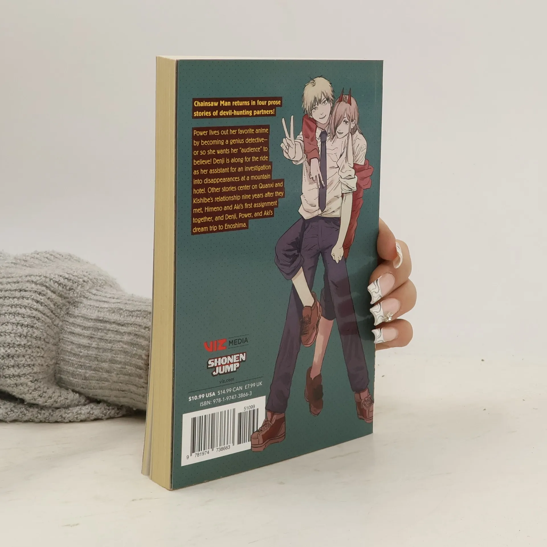 Chainsaw Man returns in four prose stories of devil-hunting partners! Power lives out her favorite anime by becoming a genius detective—or so she wants her “audience” to believe! Denji is along for the ride as her assistant for an investigation into disappearances at a mountain hotel. Other stories center on Quanxi and Kishibe’s relationship nine years after they met, Himeno and Aki’s first assignment together, and Denji, Power, and Aki’s dream trip to Enoshima.