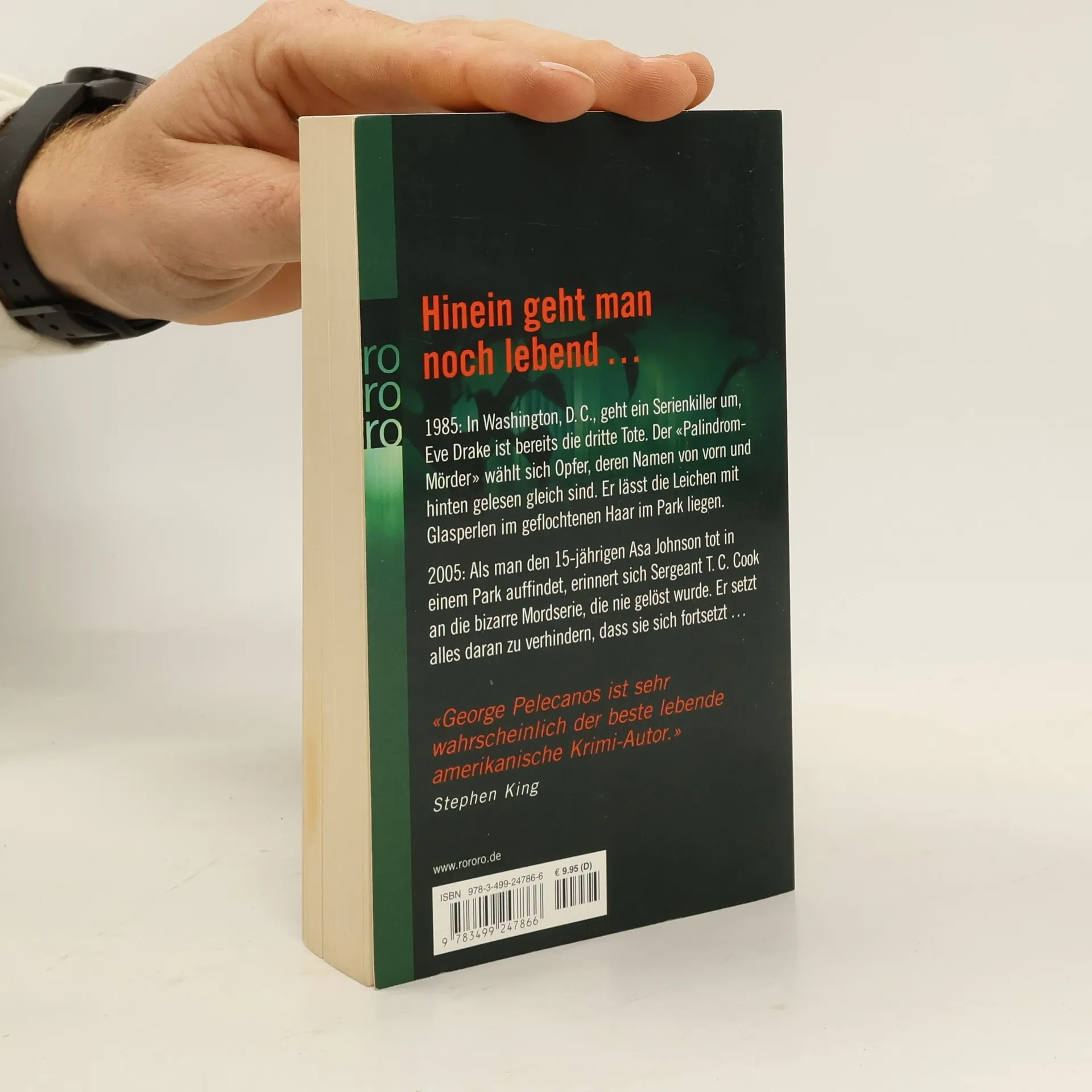 Hinein geht man noch lebend … 1985: In Washington D. C. geht ein Serienkiller um, Eve Drake ist bereits die dritte Tote. Der „Palindrom-Mörder“ wählt sich Opfer, deren Namen von vorn und hinten gelesen gleich sind. Er lässt die Leichen mit Glasperlen im geflochtenen Haar im Park liegen. 2005: Als man den 15jährigen Asa Johnson tot in einem Park auffindet, erinnert sich Sergeant T. C. Cook an die bizarre Mordserie, die nie gelöst wurde. Er setzt alles daran, zu verhindern, dass sie sich fortsetzt … „George Pelecanos ist sehr wahrscheinlich der beste lebende amerikanische Krimi-Autor.“ (Stephen King)