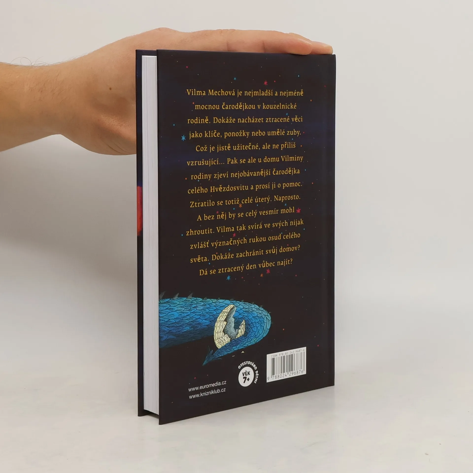 Vilma Mechová je nejmladší a nejméně nadanou čarodějkou v kouzelnické rodině. Dokáže nacházet ztracené věci jako klíče, ponožky nebo umělé zuby. Což je jistě užitečné, ale ne příliš vzrušující… Pak se ale na prahu Vilmina pokoje zjeví nejmocnější čarodějka celého Hvězdosvitu a prosí ji o pomoc. Ztratilo se totiž celé minulé úterý. Naprosto. A bez něj by se celý vesmír mohl zhroutit. Vilma tak svírá ve svých nijak zvlášť význačných rukou osud celého světa. Dokáže zachránit svůj domov? Dá se ztracený den vůbec najít?