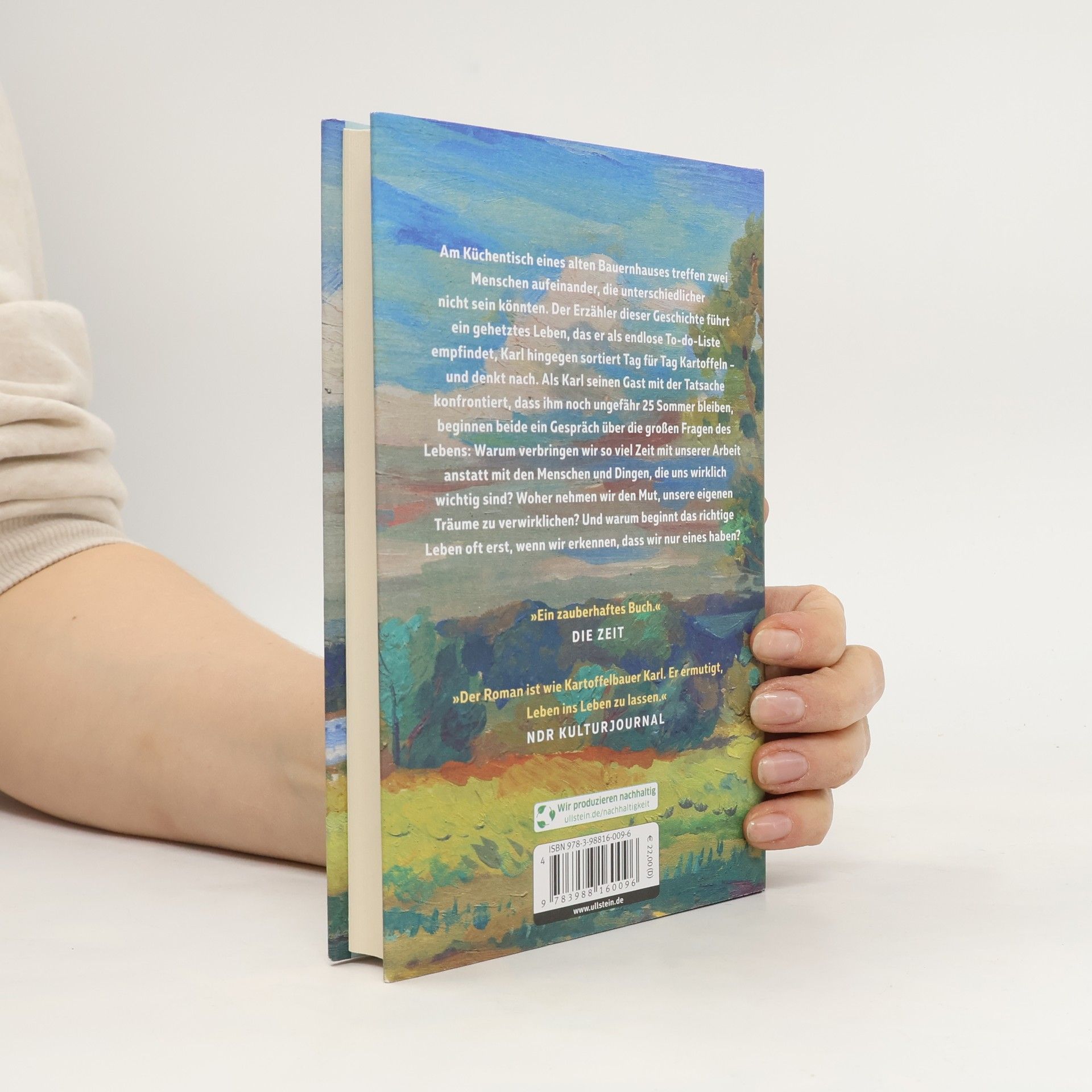 Am Küchentisch eines alten Bauernhauses treffen zwei sehr unterschiedliche Menschen aufeinander. Der Erzähler führt ein gehetztes Leben, das er als endlose To-do-Liste empfindet, während Karl, der Tag für Tag Kartoffeln sortiert, in Ruhe nachdenkt. Als Karl seinem Gast mitteilt, dass ihm noch etwa 25 Sommer bleiben, entfaltet sich ein tiefgründiges Gespräch über die großen Fragen des Lebens: Warum investieren wir so viel Zeit in die Arbeit anstatt in die Menschen und Dinge, die uns wirklich wichtig sind? Woher nehmen wir den Mut, unsere Träume zu verwirklichen? Und warum beginnt das richtige Leben oft erst, wenn wir erkennen, dass wir nur eines haben? Der Autor regt dazu an, Antworten in uns selbst zu suchen. Diese Erzählung ist warm und tiefgründig, sie spricht unsere Sehnsucht nach einem ausgewogenen Leben an und nimmt uns mit zu Karl und seinem Hof, zum See und auf den Kartoffelacker. Es ist eine Geschichte über Freundschaft, über das Zuviel und Zuwenig im Leben und über die Fragen, auf die wir alle Antworten finden möchten. Der Roman ermutigt, das Leben zu leben und vermittelt ein Gefühl der Dankbarkeit für kostbare Momente.