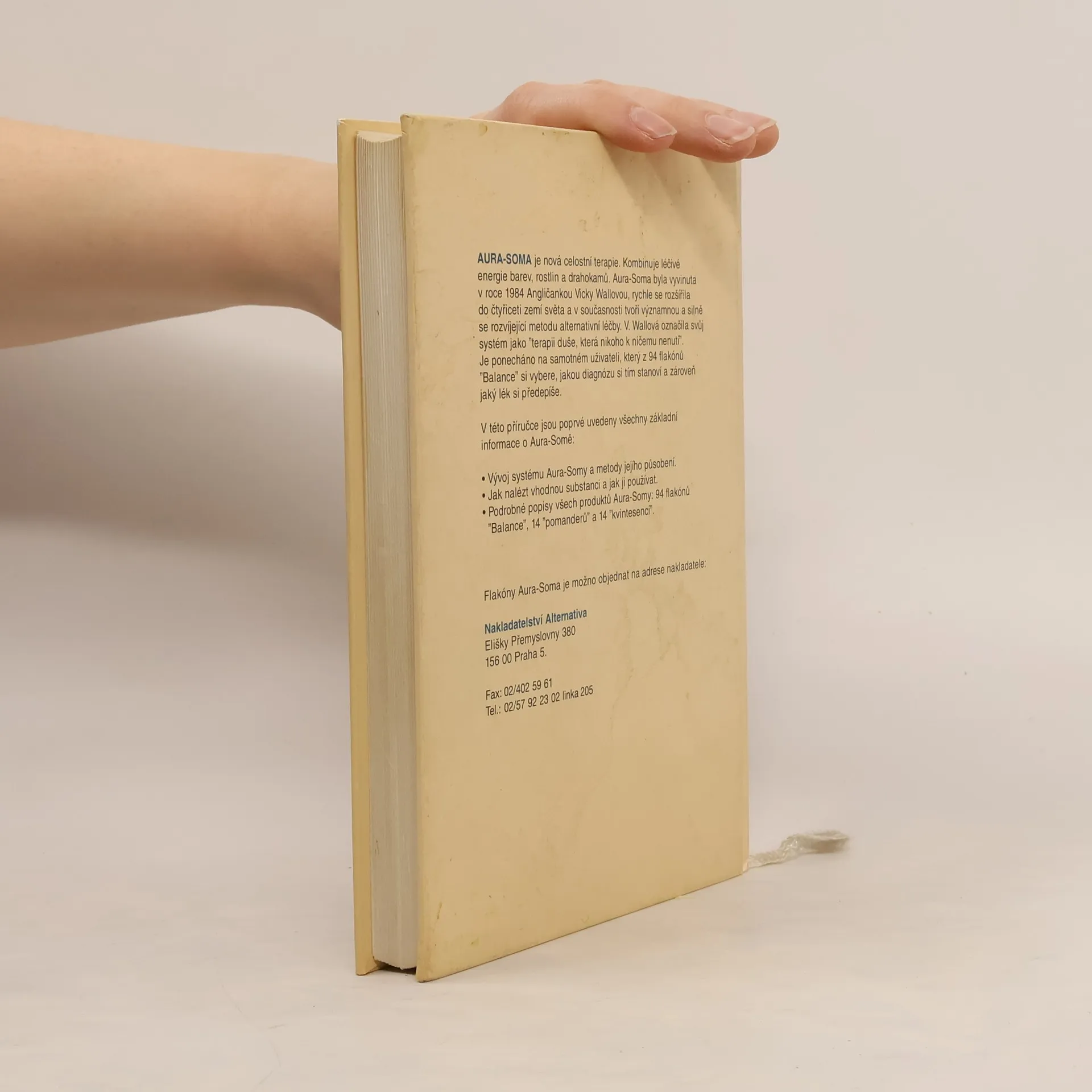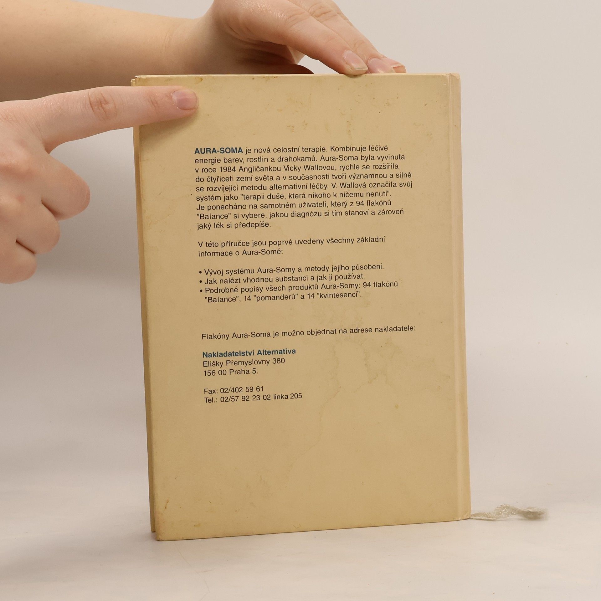 Celostní terapie kombinující léčivé energie barev, rostlin a drahokamů, Aura-Soma, byla vyvinuta Angličankou Vicky Wallovou (1984), rychle se rozšířila do čtyřiceti zemí světa a v současnosti tvoří významnou a silně se rozvíjející metodu alternativní léčby. V. Wallová označila svůj systém jako "terapii duše, která nikoho k ničemu nenutí". Je ponecháno na samotném uživateli, který z 94 flakónů "Balance" si vybere, jakou diagnózu si tím stanoví a zároveň jaký lék si předepíše. Kniha obsahuje všechny základní informace o této terapii (vývoj a metody působení, nalezení a používání vhodné substance): - Vývoj systému Aura-Somy a metody jejího působení. - Jak nalézt vhodnou substanci a jak ji používat. - Podrobné popisy všech produktů Aura-Somy: 94 flakónů "Balance", 14 "pomanderů" a 14 "kvintesencí".