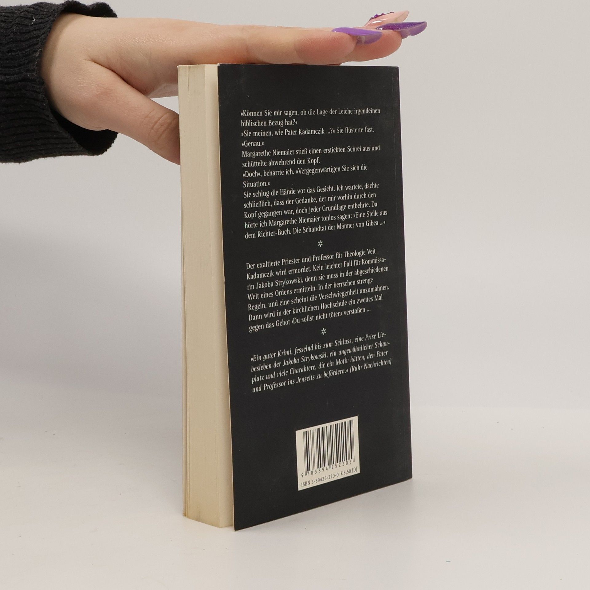 Welcher Tag passt besser für einen Mord an einem Priester als ein Sonntag? Keiner, meint Kommissarin Jakoba Strykowski. Ansonsten passt ihr der Fall allerdings gar nicht: Eigentlich wollte sie in den Urlaub fahren, und eigentlich wollte sie mit dem Kollegen Werner nicht mehr zusammenarbeiten. Und nun muss sie gemeinsam mit ihm den Mord an dem exaltierten Priester Veit Kadamczik aufklären. Sie ermittelt in der abgeschiedenen Welt eines Ordens, in der strenge Regeln herrschen, und eine scheint die Verschwiegenheit anzumahnen. Da wird ein zweites Mal gegen das Gebot ›Du sollst nicht töten‹ verstoßen … 'Kommissarin Jakoba Strykowski muss in einer Theologischen Hochschule ermitteln. Wider Erwarten ist eine Verdächtige schnell gefunden; denn Veit Kadamczik, der tote Priester und Professor, war noch am Nachmittag an einem Eklat beteiligt: Die feministische Theologin Verena Carsten hatte in ihrem Tagungsvortrag Kadamcziks Auslegung einer Bibelstelle heftig kritisiert. Der theologische Disput mündete in einer Tätlichkeit. Und fand der Streit am Abend eine Fortsetzung mit tödlichem Ausgang? Kein leichter Fall für die Kommissarin; denn sie muss in der abgeschiedenen Welt eines Ordens ermitteln.' (Literatur-Report)