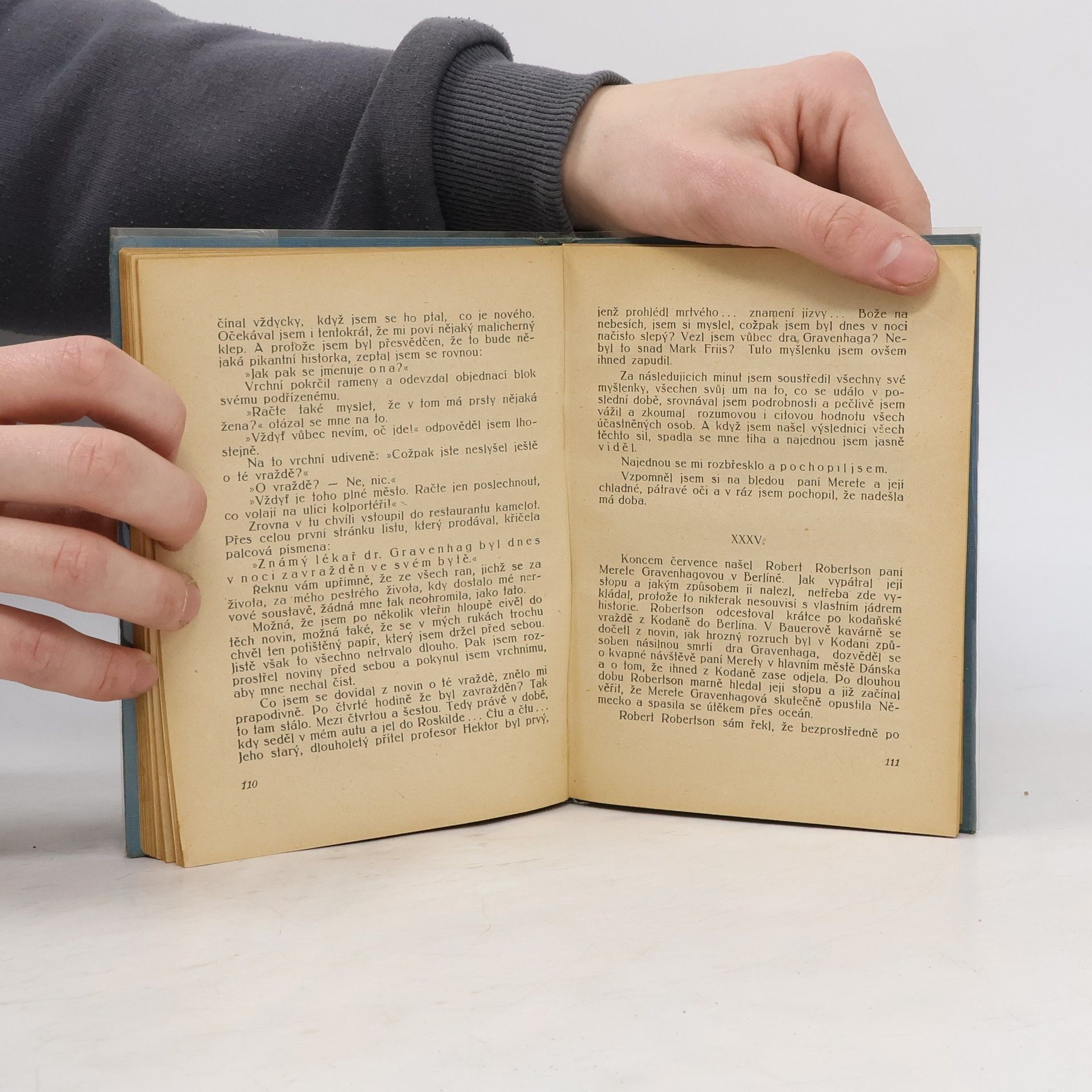 Autor předkládá příběh vraždy známého Kodaňského chirurga dra Gravenhaga, kdy po třech měsících od jeho pohřbu je v Berlíně zavražděn muž, který vypadá zcela jako dr. Gravenhag, má jeho jizvu na zádech a jeho doklady. Popis situace a vyšetřování obou vražd, v němž je policie bezradná, prokládá vyprávěním dobrodruha Roberta Robertsona. Ten totiž odhalil proč a jak k oběma vraždám došlo.