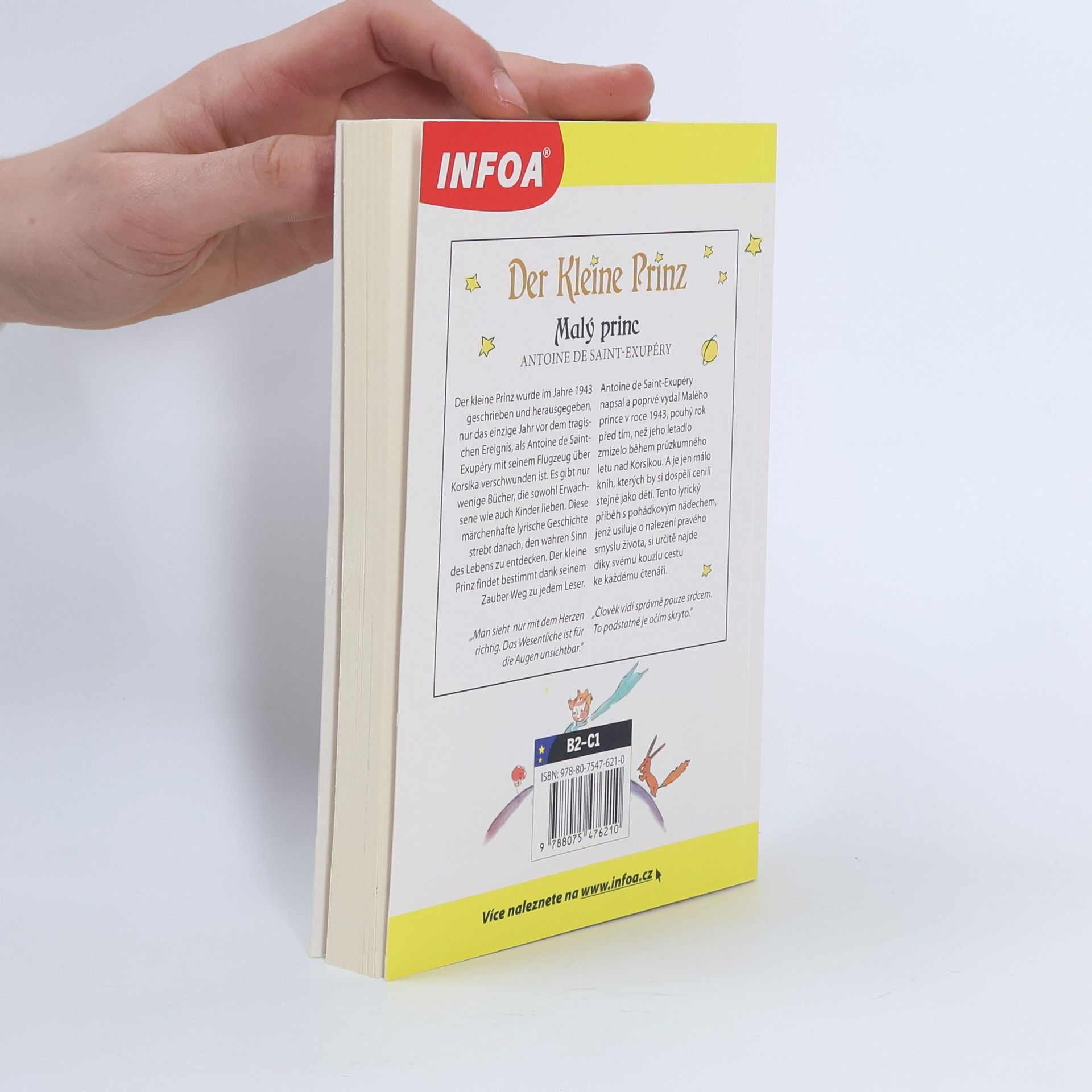 Antoine de Saint-Exupéry napsal a poprvé vydal Malého prince v roce 1943, pouhý rok před tím, než jeho letadlo zmizelo během průzkumného letu nad Korsikou. A je jen málo knih, kterých by si dospělí cenili stejně jako děti. Tento lyrický příběh s pohádkovým nádechem, jenž usiluje o nalezení pravého smyslu života, si určitě najde díky svému kouzlu cestu ke každému čtenáři. „Člověk vidí správně pouze srdcem. To podstatné je očím skryto.” Německo - český zrcadlový text pro mírně a středně pokročilé Antoine de Saint-Exupéry schrieb und veröffentlichte The Little Prince 1943, nur ein Jahr bevor sein Flugzeug während eines Aufklärungsfluges über Korsika verschwand. Und es gibt nur wenige Bücher, die Erwachsene so schätzen würden wie Kinder. Diese lyrische Geschichte mit einem märchenhaften Touch, die den wahren Sinn des Lebens finden will, wird dank ihres Charmes sicherlich ihren Weg zu jedem Leser finden. "Man sieht nur mit dem Herzen richtig. Das Wesentliche ist unsichtbar. “ Deutsch - Tschechischer Spiegeltext für Fortgeschrittene.