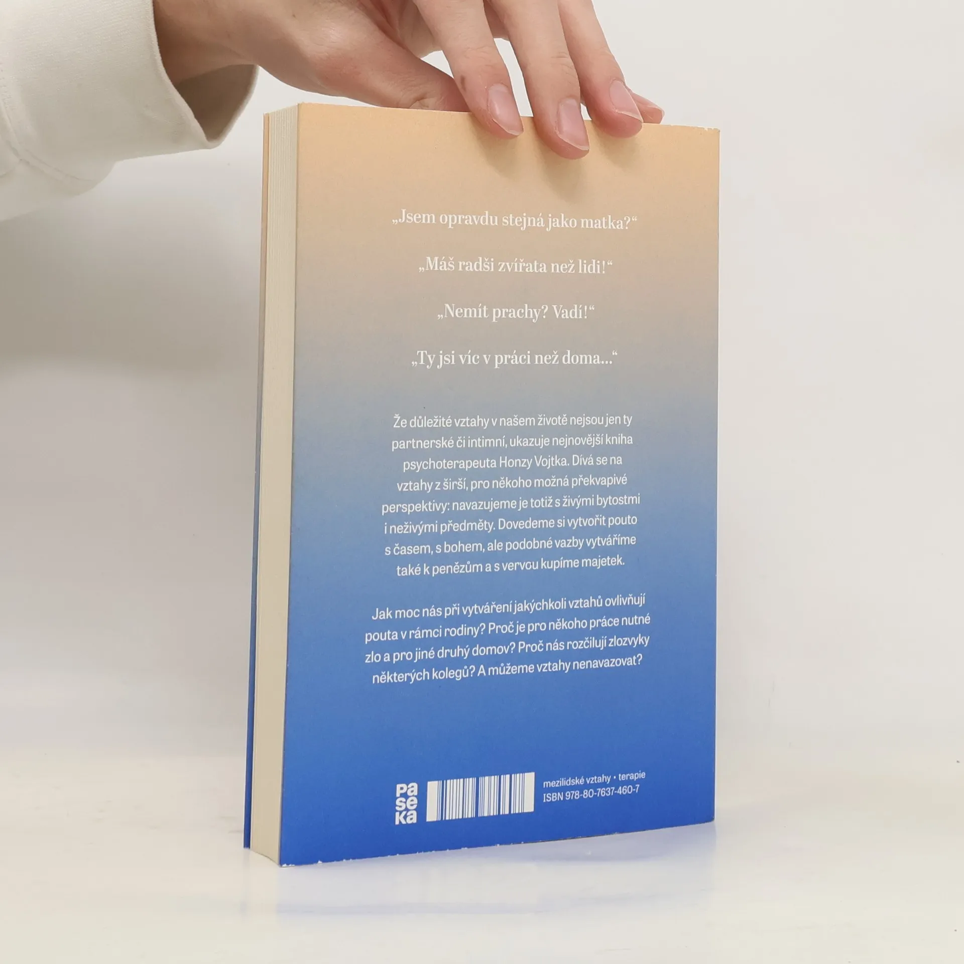 „Jsem opravdu stejná jako matka? „Máš radši zvířata než lidi! „Nemít prachy? Vadí! „Ty jsi víc v práci než doma Že důležité vztahy v našem životě nejsou jen ty partnerské či intimní, ukazuje nejnovější kniha psychoterapeuta Honzy Vojtka. Dívá se na vztahy z širší, pro někoho možná překvapivé perspektivy: navazujeme je totiž s živými bytostmi i neživými předměty. Dovedeme si vytvořit pouto s časem, s bohem, ale podobné vazby vytváříme také k penězům a s vervou kupíme majetek. Jak moc nás při vytváření jakýchkoliv vztahů ovlivňují pouta v rámci rodiny? Proč je pro někoho práce nutné zlo a pro jiné druhý domov? Proč nás rozčilují zlozvyky některých kolegů? A můžeme vztahy nenavazovat?
