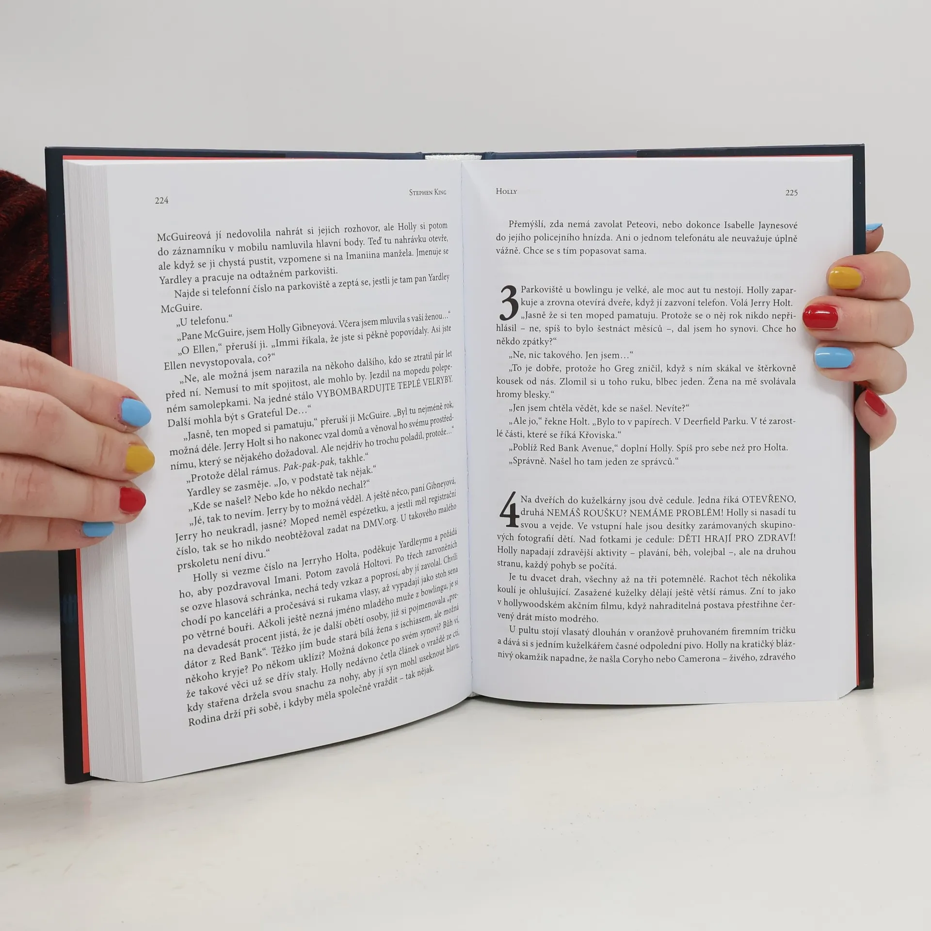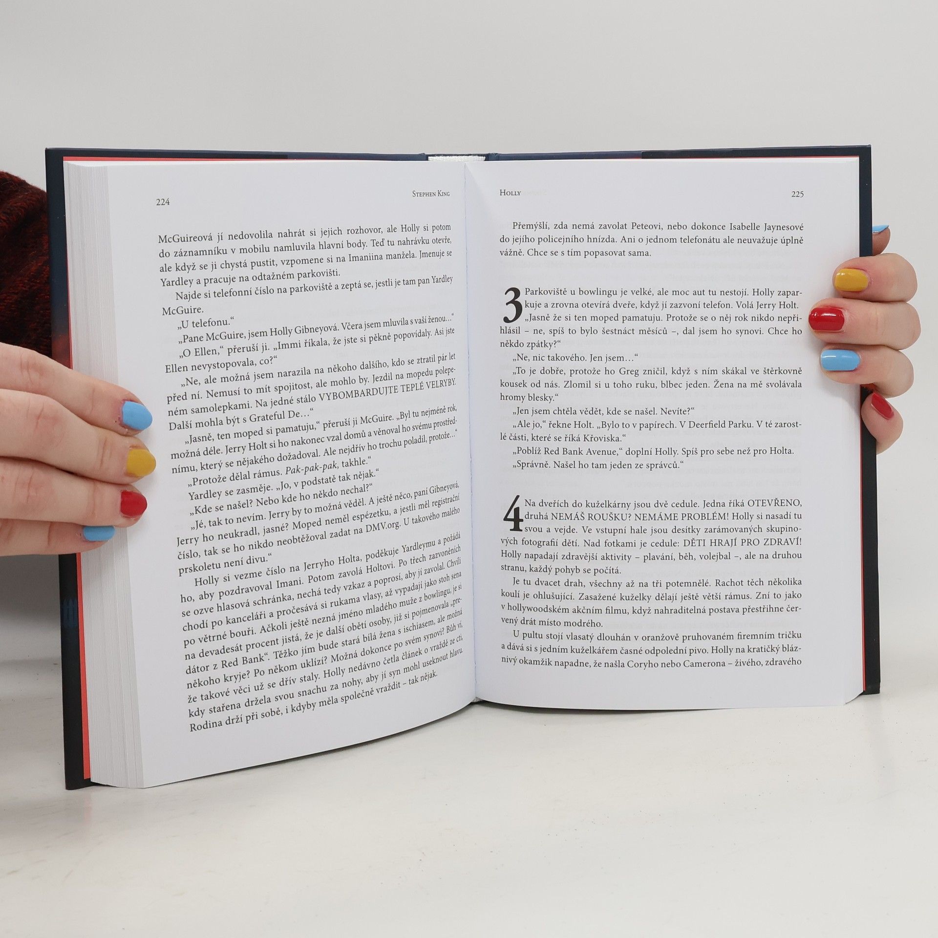 Holly Gibneyová, jedna z nejpodmanivějších a nejvynalézavějších postav Stephena Kinga, se vrací v tomto napínavém románu, aby vyřešila hrůznou pravdu o několikanásobném zmizení v městečku na Středozápadě. Holly Stephena Kinga představuje triumfální návrat oblíbené postavy Holly Gibneyové. Čtenáři byli svědky Hollyina postupného přerodu z plaché (ale také statečné) samotářky v románu Pan Mercedes přes partnerku Billa Hodgese v knize Právo nálezce až po plnohodnotnou, chytrou a občas drsnou soukromou detektivku v knize Outsider. V novém Kingově románu je Holly odkázána sama na sebe a stojí proti dvojici nepředstavitelně zvrácených a skvěle maskovaných protivníků. Když Penny Dahlová zavolá do detektivní agentury Finders Keepers a doufá, že jí pomůžou najít její ztracenou dceru, Holly se zdráhá případ přijmout. Její partner Pete má covid. Její velmi komplikovaná matka právě zemřela. A Holly má být na dovolené. Ale něco v zoufalém hlase Penny Dahlové způsobí, že Holly nemůže odmítnout. Jen pár bloků od místa, kde zmizela Bonnie Dahlová, žijí profesoři Rodney a Emily Harrisovi. Jsou to manželé osmdesátníci, oddaní jeden druhému a celoživotní akademici v částečném důchodu. Ve sklepě svého dobře udržovaného, knihami obloženého domu, však ukrývají hrozivé tajemství, které možná souvisí s Bonniiným zmizením. A ukáže se, že je téměř nemožné odhalit, co mají za lubem: jsou bystří, trpěliví a bezohlední. Holly musí zapojit všechny své ohromné schopnosti, aby v tomto novém mrazivém mistrovském díle Stephena Kinga přechytračila a přelstila zvrácené profesory.