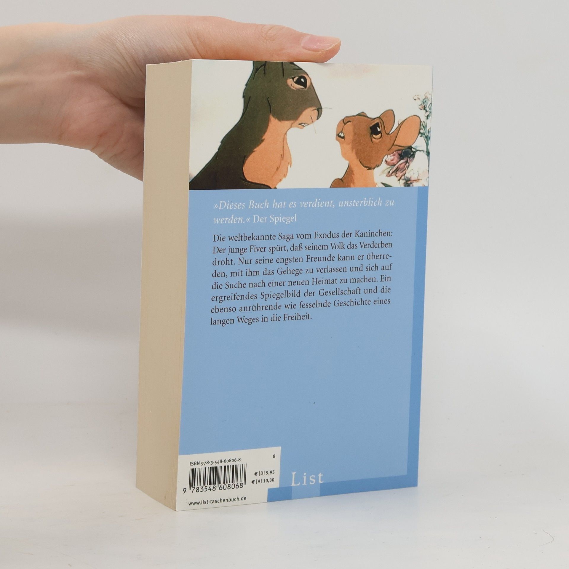 Die weltbekannte Saga vom Exodus der Kaninchen: Der junge Fiver spürt, dass seinem Volk das Verderben droht. Nur seine engsten Freunde kann er überreden, mit ihm das Kaninchengehege zu verlassen und sich auf die Suche nach einer neuen Heimat zu machen. Was sie unterwegs durchleben, ist so beispielhaft wie fesselnd: zahllose Abenteuer, Meuterei, Treuebruch und Heldentum, Schlachten mit hohem Blutzoll – und schließlich der glückliche Einzug ins Land der Freiheit und des Friedens.