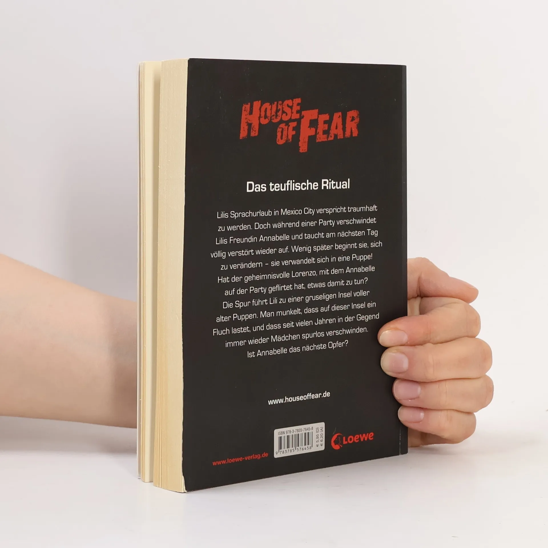 Lilis Sprachurlaub in Mexico City verspricht, traumhaft zu werden. Doch während einer Party verschwindet Lilis Freundin Annabelle und taucht am nächsten Tag völlig verstört wieder auf. Wenig später beginnt sie, sich zu verändern - sie verwandelt sich in eine Puppe! Hat der geheimnisvolle Lorenzo, mit dem Annabelle auf der Party geflirtet hat, etwas damit zu tun? Die Spur führt Lili zu einer gruseligen Insel voller alter Puppen. Man munkelt, dass auf dieser Insel ein Fluch lastet, und dass seit vielen Jahren in der Gegend immer wieder Mädchen spurlos verschwinden. Ist Annabelle das nächste Opfer? Mehr Infos rund ums Buch unter: www.houseoffear.de