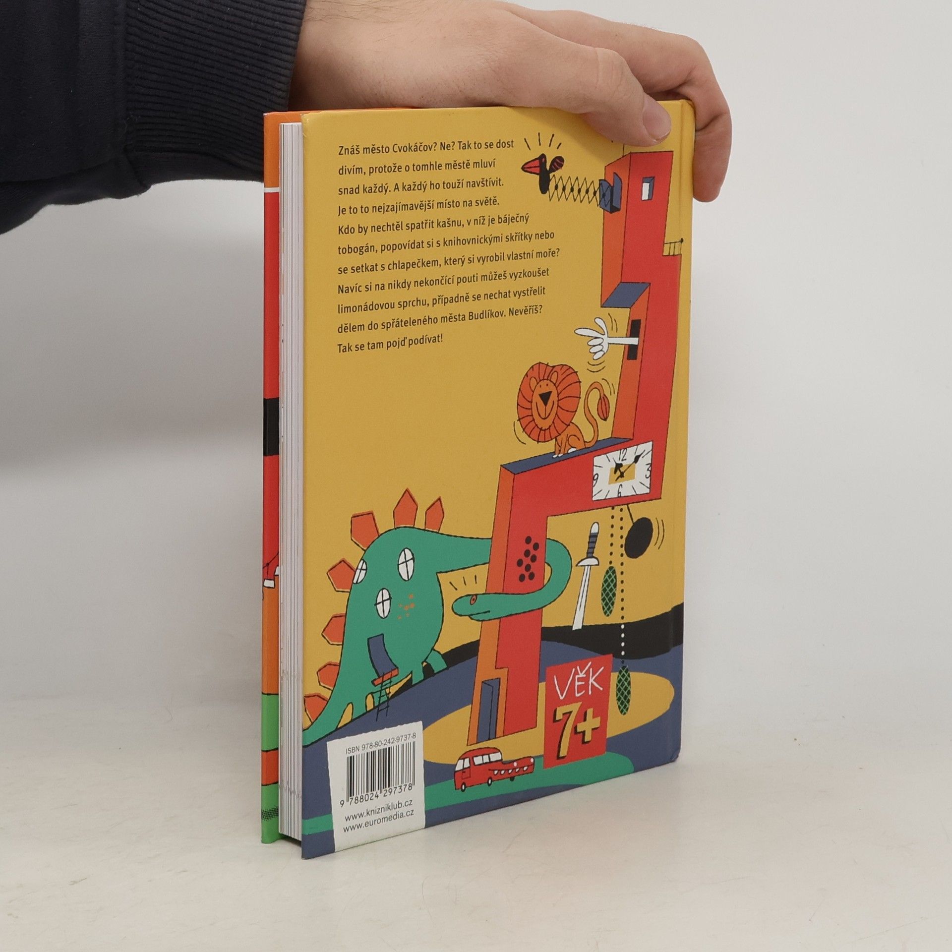 Znáš město Cvokáčov? Ne? Tak to se dost divím, protože o tomhle městě mluví snad každý. A každý ho touží navštívit. Je to to nejzajímavější místo na světě. Kdo by nechtěl spatřit kašnu, v níž je báječný tobogán, popovídat si s knihovnickými skřítky nebo se setkat s chlapečkem, který si vyrobil vlastní moře? Navíc si na nikdy nekončící pouti můžeš vyzkoušet limonádovou sprchu, případně se nechat vystřelit dělem do spřáteleného města Budlíkov. Nevěříš? Tak se tam pojď podívat!