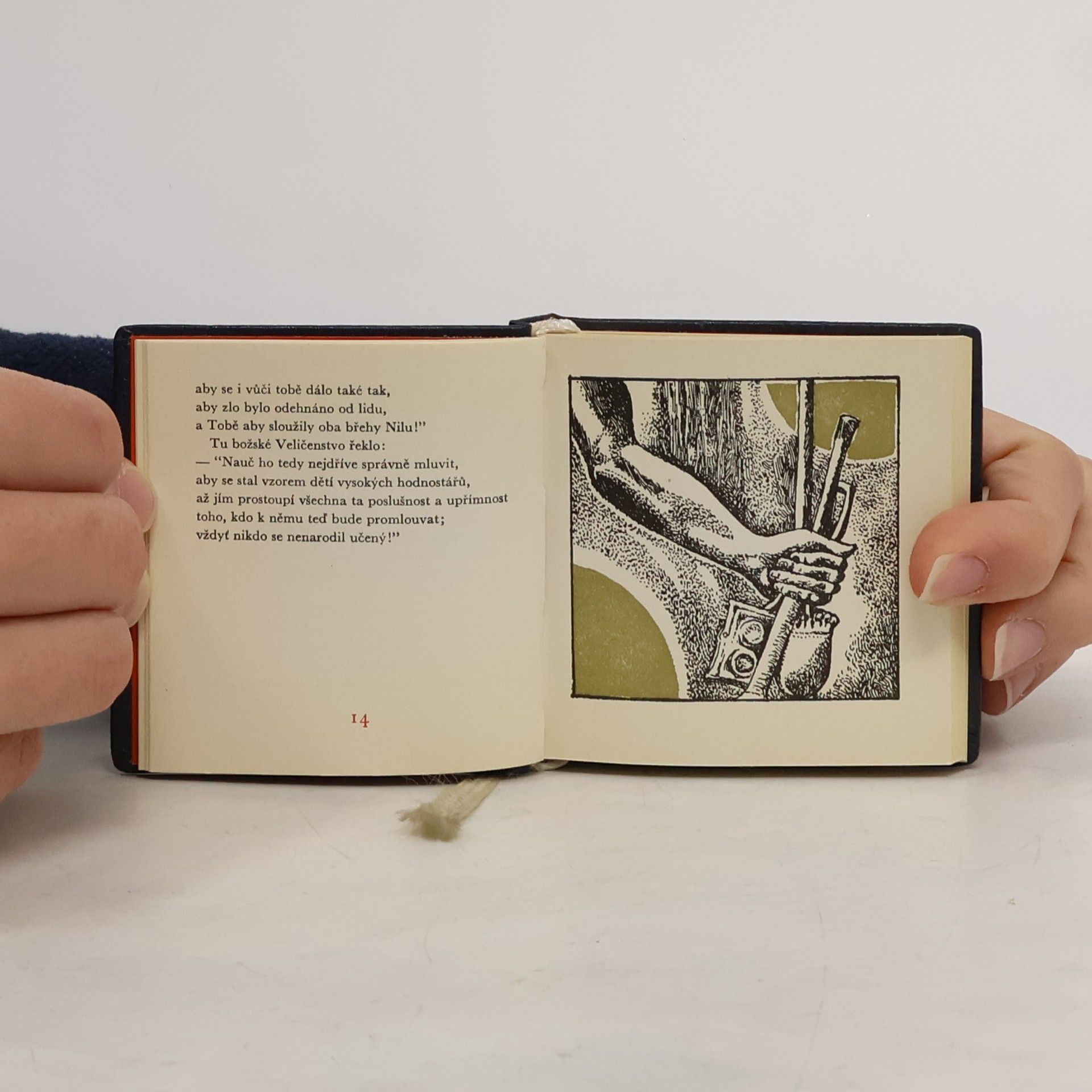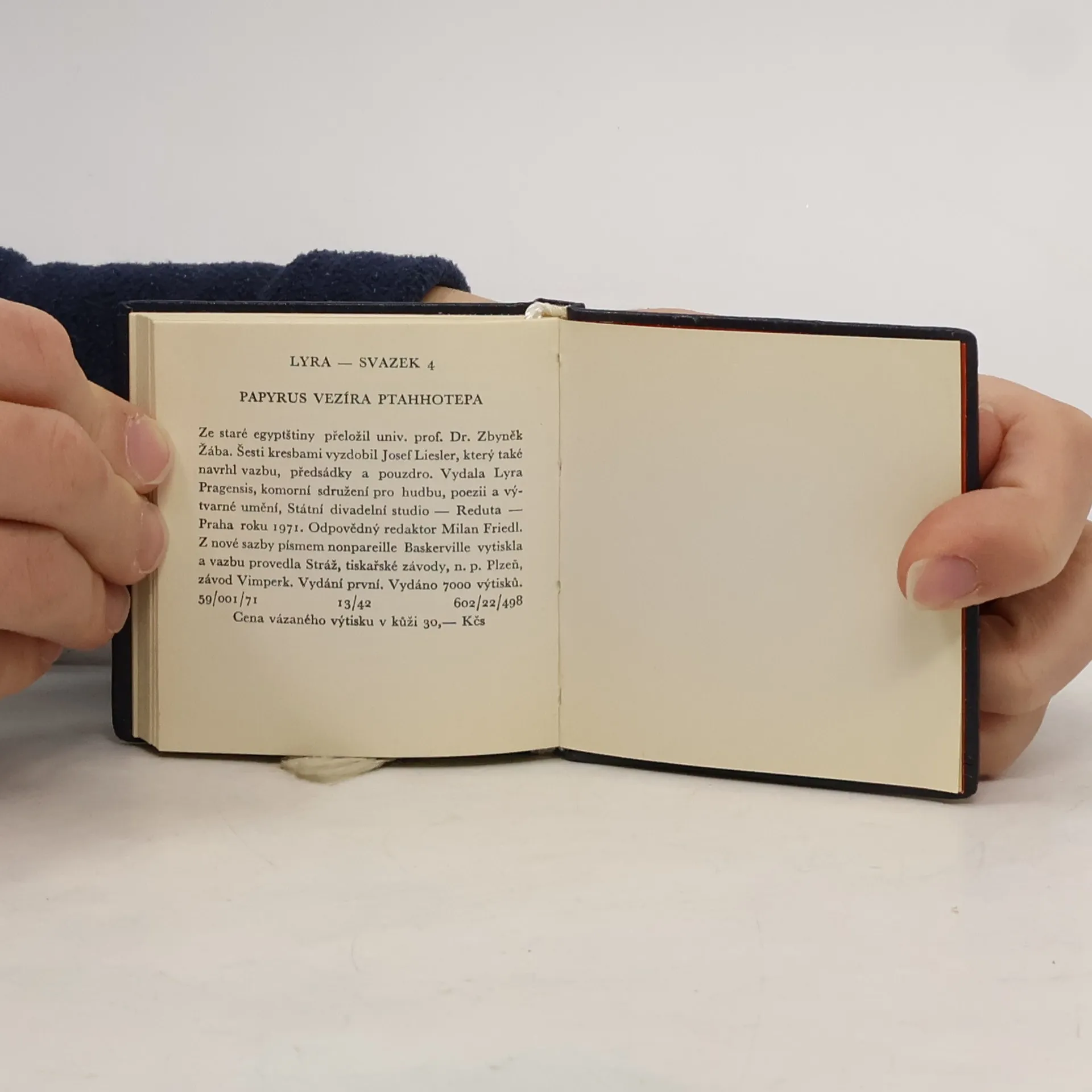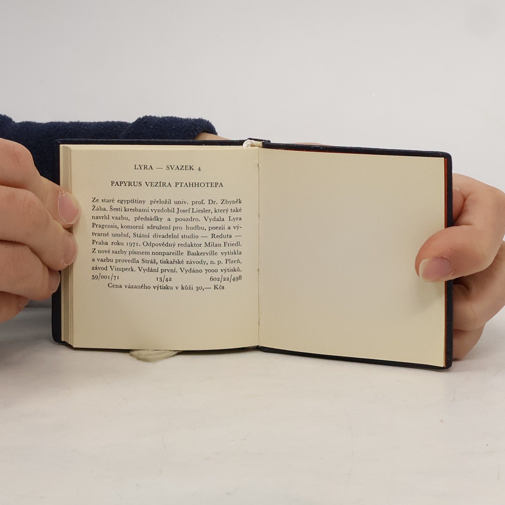 Naučení starosty sídelního města, vezíra Ptahhotepa. Naučení, které podává otec svému synovi. Vydala Lyra Pragensis -1971. Knížečka vázaná v kůži, se záložkou. Rozměry - 17,5 x 17,5 x 1 cm.