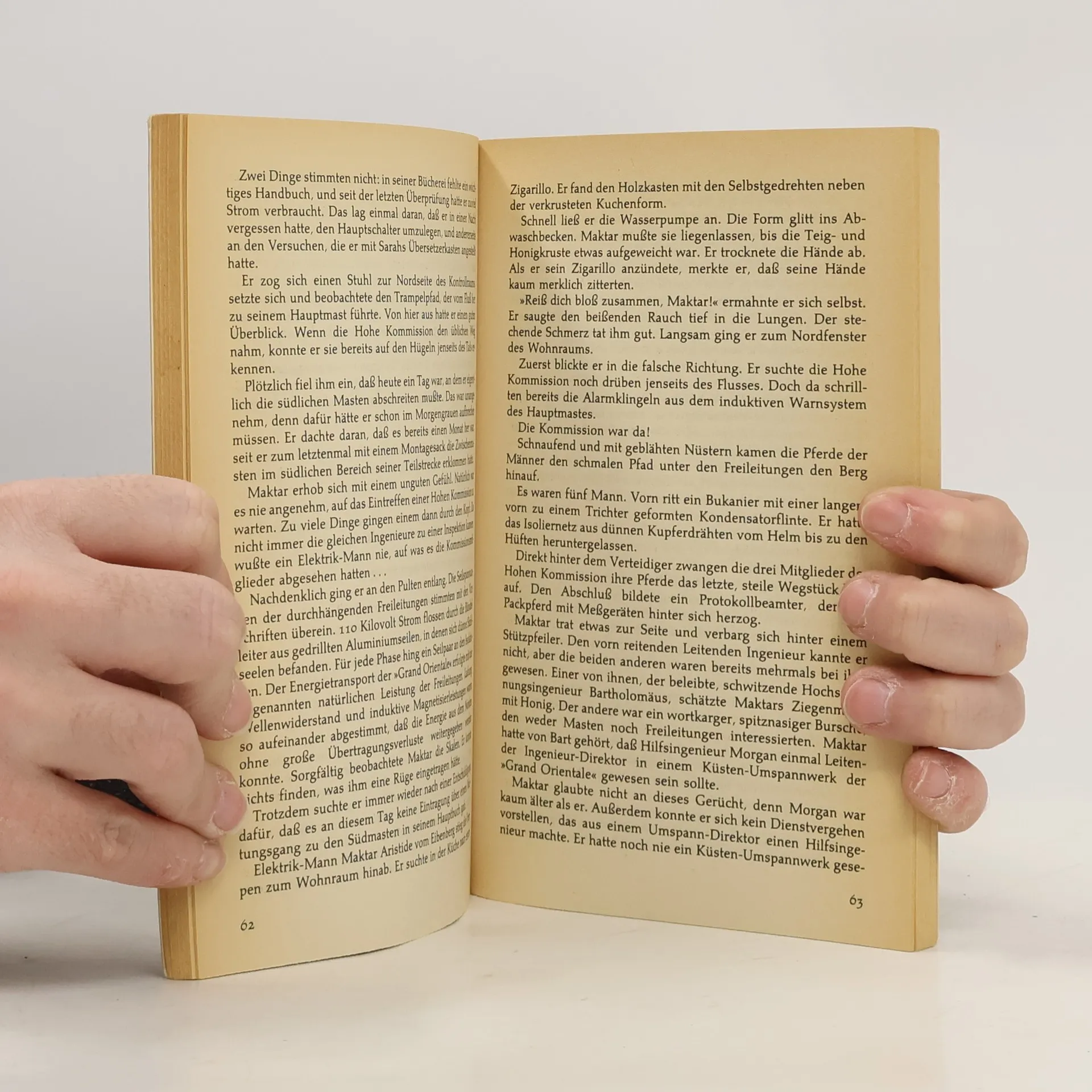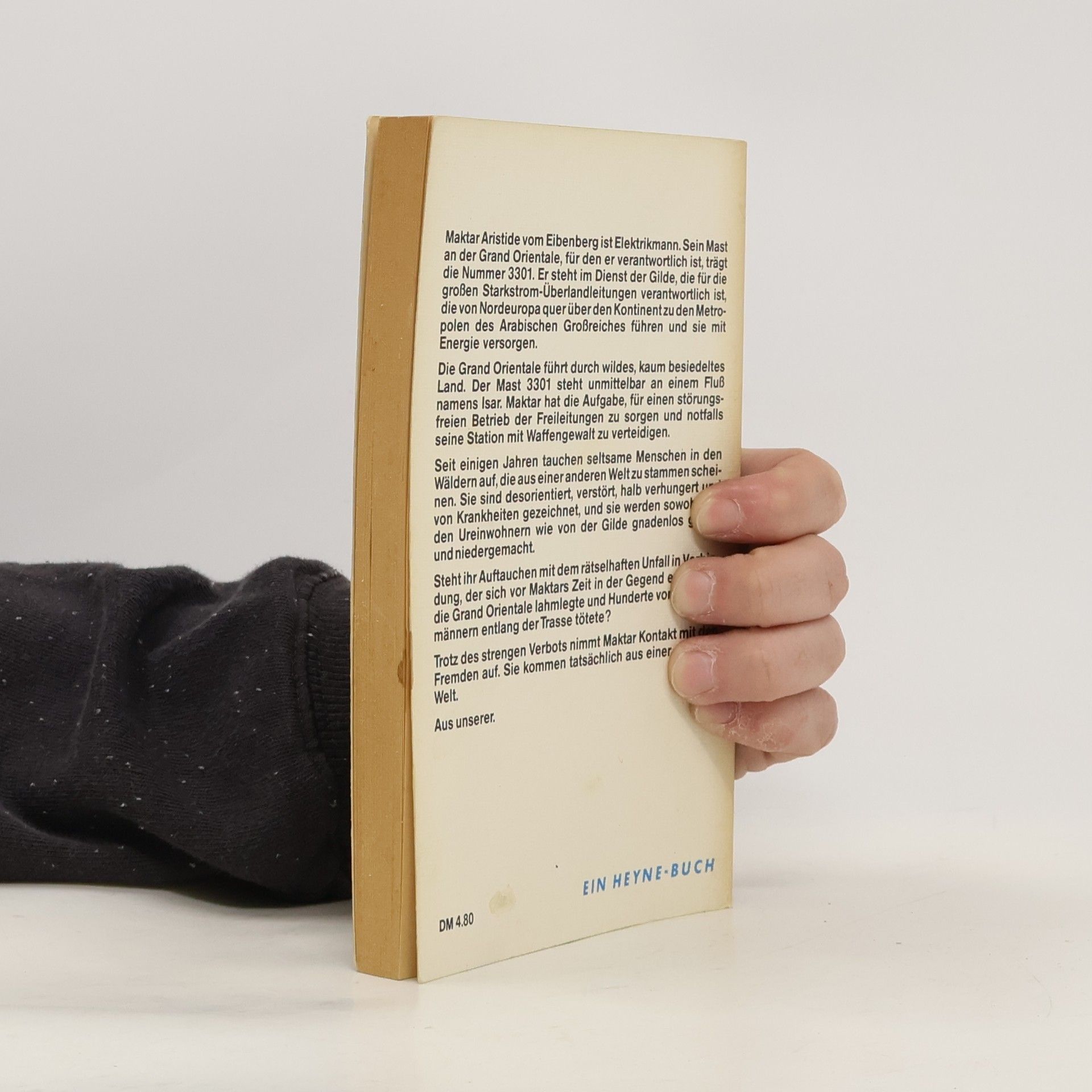 Maktar Aristide vom Eibenberg ist Elektrikmann. Er steht im Dienst der Gilde für die großen Starkstrom-Überlandleitungen, die von Nordeuropa quer über den Kontinent durch wildes, kaum besiedeltes Land bis zu den Metropolen des Arabischen Großreiches führen und sie mit Energie versorgen. Die Grand Orientale führt durch eine wildes, kaum besiedeltes Land.Der Mast mit der Nummer 3301 steht unmittelbar an einem Fluss namens Isar. Maktar hat die Aufgabe, für einen störungsfreien Betrieb im Netz zu sorgen und seinen Hauptturm mit integriertem Windrad notfalls mit Waffengewalt zu verteidigen. Seit einigen Jahren tauchen seltsame Menschen in den Wäldern auf, die angeblich aus einer fremden, hochtechnisierten Welt stammen sollen. Doch sie sind desorientiert, von seltsamen Krankheiten gezeichnet und werden gnadenlos gejagt. Steht ihr Auftauchen mit dem rätselhaften Energie-Unfall in Verbindung, der sich vor Marktars Zeit ereignete und Hunderte von Elektrikmännern entlang der ganzen Trasse tötete? Trotz strengen Verbots nimmt Maktar Kontakt mit den Fremden auf. Sie kommen tatsächlich aus einer anderen Welt. Aus unserer.Pressestimmen:“Vor allem aber ist in der Parallelwelt, durch der Elektrikmann Aristide vom Eibenberg marschiert, Abenteuer angesagt.” PLAYBOY
