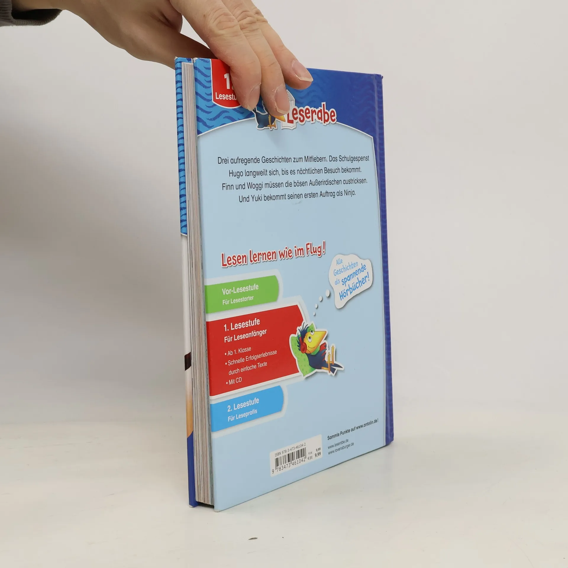 Die besten Abenteuergeschichten in einem Band! Zum Anhören und Mitlesen! Lesen lernen wie im Flug! Die Kinderbücher der Reihe Leserabe – 1. Lesestufe wurden mit Pädagogen entwickelt und richten sich an Leseanfänger ab der 1. Klasse. Kurze Texte in großer Fibelschrift sichern erste Leseerfolge und steigern die Lesekompetenz von Mädchen und Jungen ab 6 Jahren. Mit Belohnungsstickern. Empfohlen von Stiftung Lesen, gelistet bei Antolin. Weitere Informationen auf leserabe. de. Drei tolle Geschichten über Ninjas, Gespenster und Außerirdische in einem Band: Yuki ist ein Junge mit magischen Kräften. Nach einer Ausbildung zum Ninja wartet der erste gefährliche Auftrag auf Yuki: Er soll einen Feuerdrachen aus einem Kloster vertreiben! Gespenst Hogo lebt in einer Schule. Als Kinder im Schulhaus übernachten, kann Hugo gemeinsam mit Freund Willi endlich mal wieder so richtig spuken! Eine ganz besondere Lesenacht beginnt... Finn düst mit seinem Weltraumhund Woggi durchs Weltall, als die beiden von Außerirdischen angegriffen werden! Sie müssen auf einem Schrottplatz notlanden. Was sie dort wohl erwartet?
