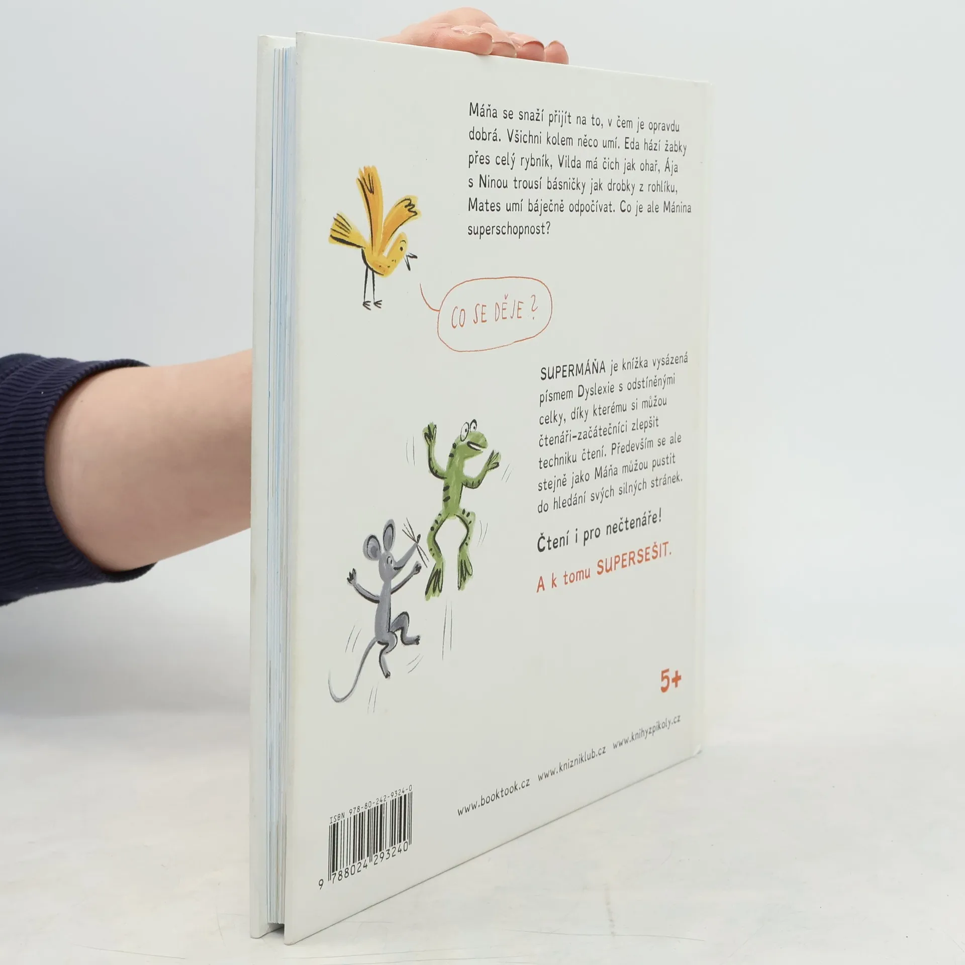 Máňa se snaží přijít na to, v čem je opravdu dobrá. Všichni kolem něco umí. Eda hází žabky přes celý rybník, Vilda má čich jak ohař, Ája s Ninou trousí básničky jak drobky z rohlíku, Mates umí báječně odpočívat. Co je ale Mánina superschopnost? Supermáňa je knížka vysázená písmem Dyslexie s odstíněnými celky. Díky tomu si můžou čtenáři začátečníci zlepšit techniku čtení. Především se ale stejně jako Máňa můžou pustit do hledání svých silných stránek. Čtení i pro nečtenáře!